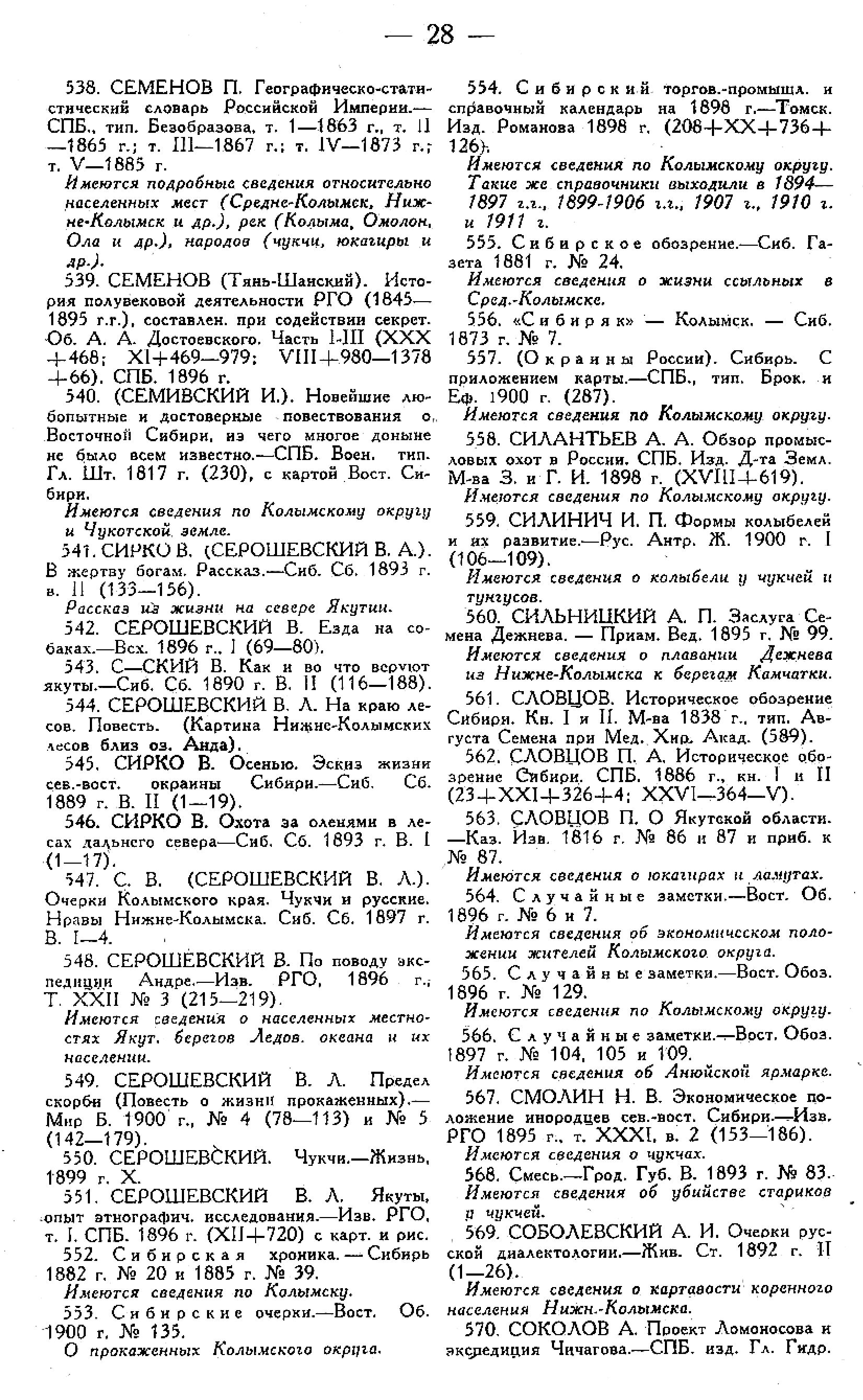 547. С. В. (СЕРОШЕВСКИЙ В. Л. ). Очерки Колымского края. Чукчи и русские. Нравы Нижне-Колымска. Сиб. Сб. 1897 г. В. 1-4.