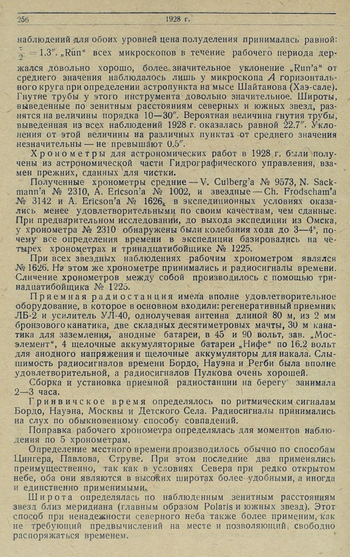 Хронометры для астрономических работ в 1928 г. били получены из астрономической части Гидрографического управления, взамен прежних, сданных для чистки.