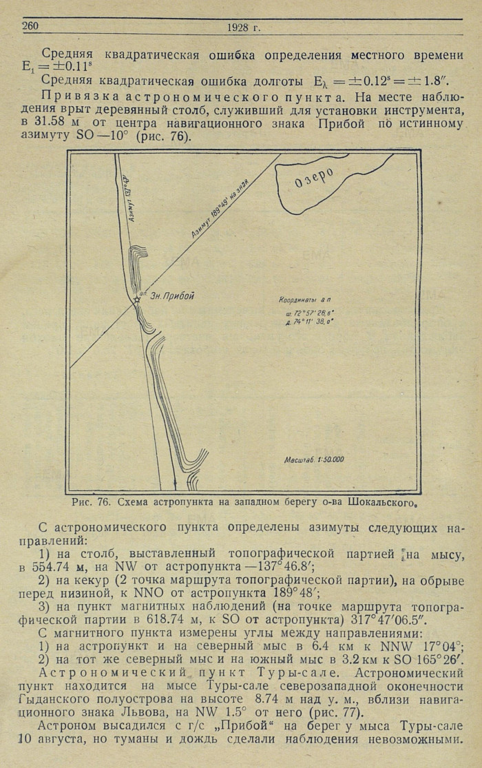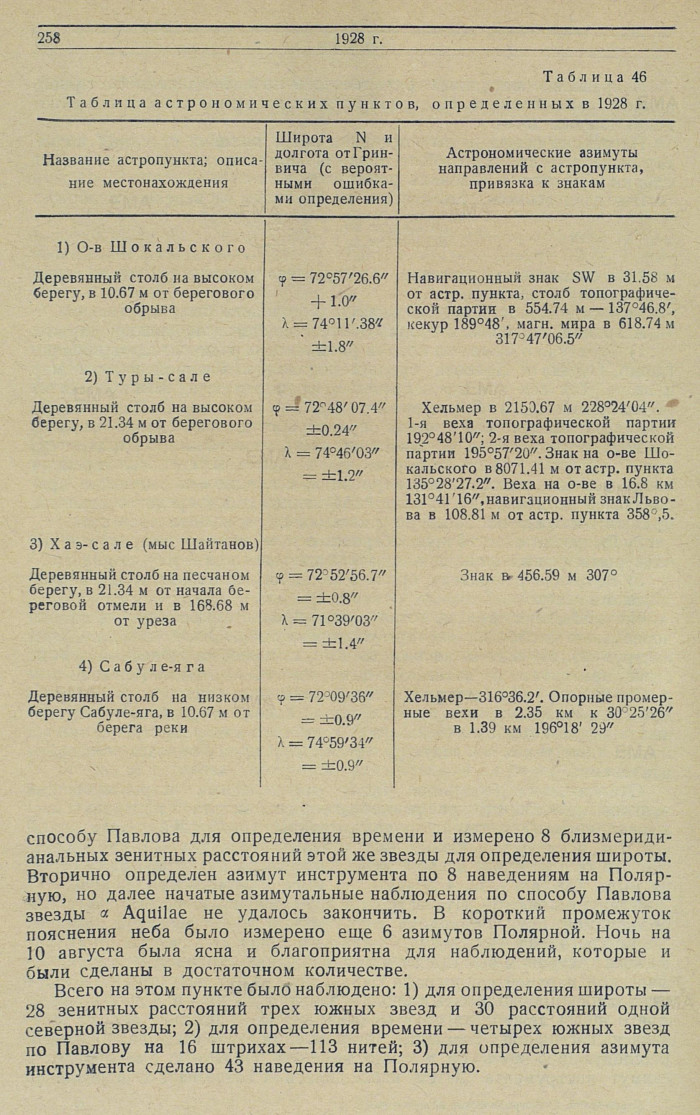 На местности пункты отмечались прочно вкопанным в землю деревянным столбом, на который во время наблюдений устанавливался инструмент. На о-ве Шокальского и мысе Львова наблюденные пункты были привязаны к навигационным знакам, на мысе Хаэ-сале и у р. Сабуле-яга — к выставленным вехам, нанесенньм на планшет мензульной съемки. Кроме того, во всех местах сделаны привязки определенных пунктов к возможно большему числу местных предметов. С той же целыо облегчения последующих розысков производилась глазомерная съемка.
