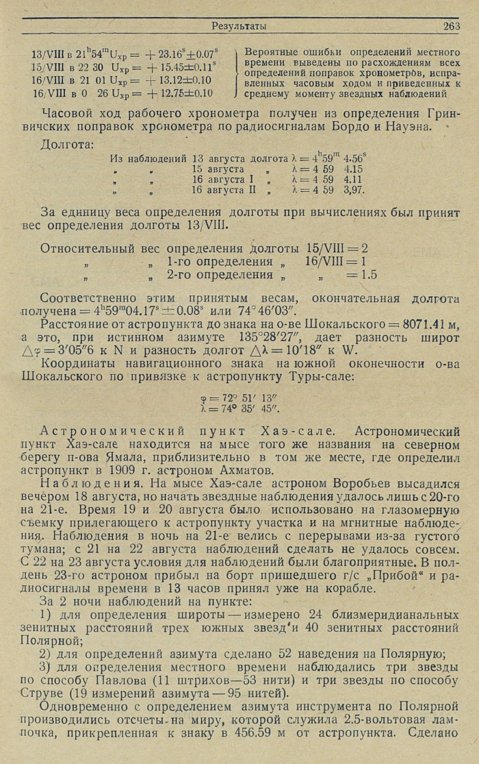 Наблюдения. Астроном был высажен на пункт с г/с „Прибой“ 30 августа утром. Условия для наблюдения вечером были неблагоприятны. Надежно определить азимут инструмента для наблюдений времени не удалось. В эту первую ночь главное внимание было обращено на наблюдения для определения широты. 31 августа вечером наблюдалась для широты а Lyrae и произведено определение азимута инструмента по 18 наведениям на Полярную. Дальнейшее дежурство у инструмента оказалось безрезультатным: сплошные тучи закрывали звезды. 1 сентября наблюдения были невозможны. 2 сентября, после приема радиосигналов, около 10 часов начаты звездные наблюдения, причем основное внимание было обращено на определение поправки хронометра относительно местного времени для вывода долготы. Утром 3 сентября к 8 часам астроном был принят на борт пришедшего г/с „Прибой".