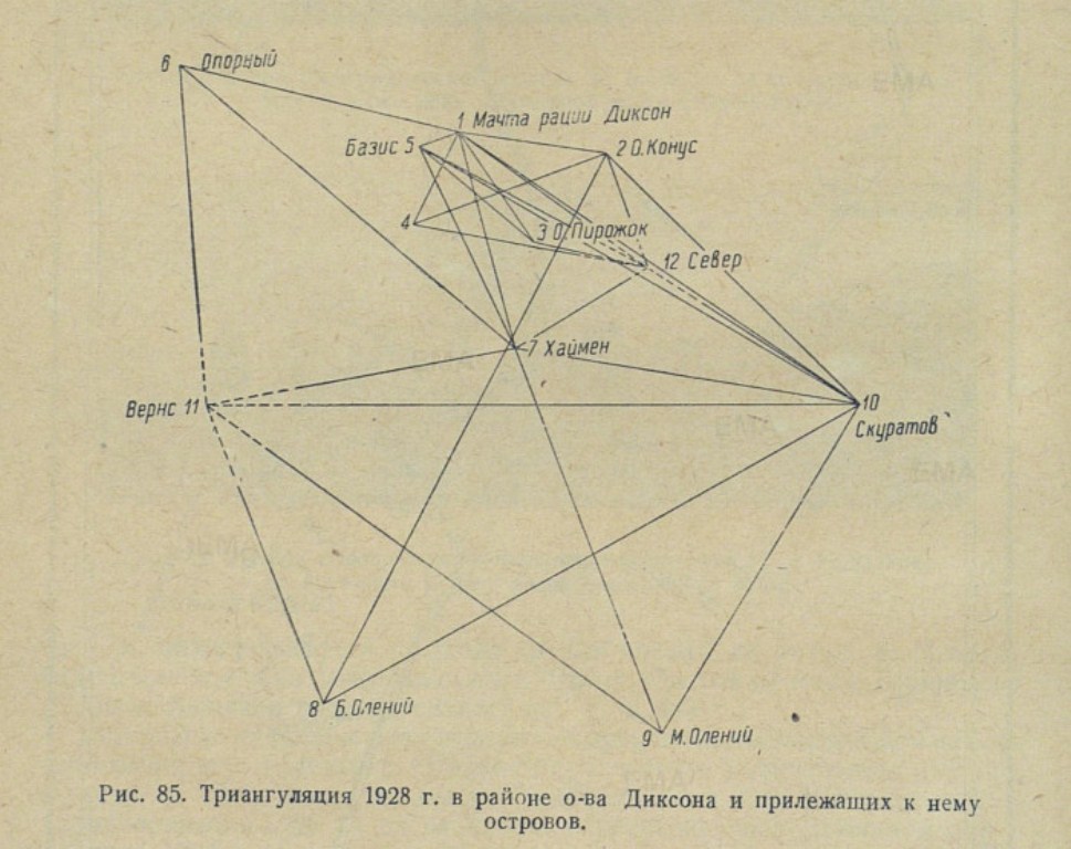 Триангуляция в районе острова Диксона связала с ним и п-вом Скуратова, о-ва Вернс и Оленьи. Тригонометрическая сеть IV класса имеет 12 пунктов.