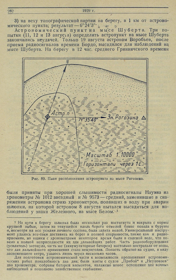 Столб астрономического пункта на мысе Рагозина поставлен на песчаной низменности, окаймляющей берег к юго-западу от навигационного знака, в расстоянии 150—200 м от уреза воды (рис. 89). От астрономического столба до навигационного знака было дважды измерено расстояние, оказавшееся равным 1 081.3 м. Истинный азимут направления с астропункта на знак по наблюдениям 1 августа оказался равным 251º35'40". По этим данным разность широт астропункт-знак получена Δφ = 10.9" к северу и разность долгот астрономический пункт — знак Δλ = 1'56." к востоку. Координаты знака, переданные с астропункта по определению 1929 г., получатся: широта 73°23'0.45", долгота 70°03'01.7".