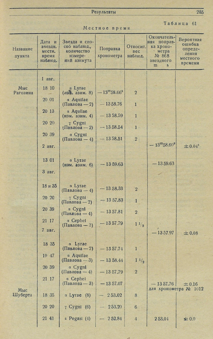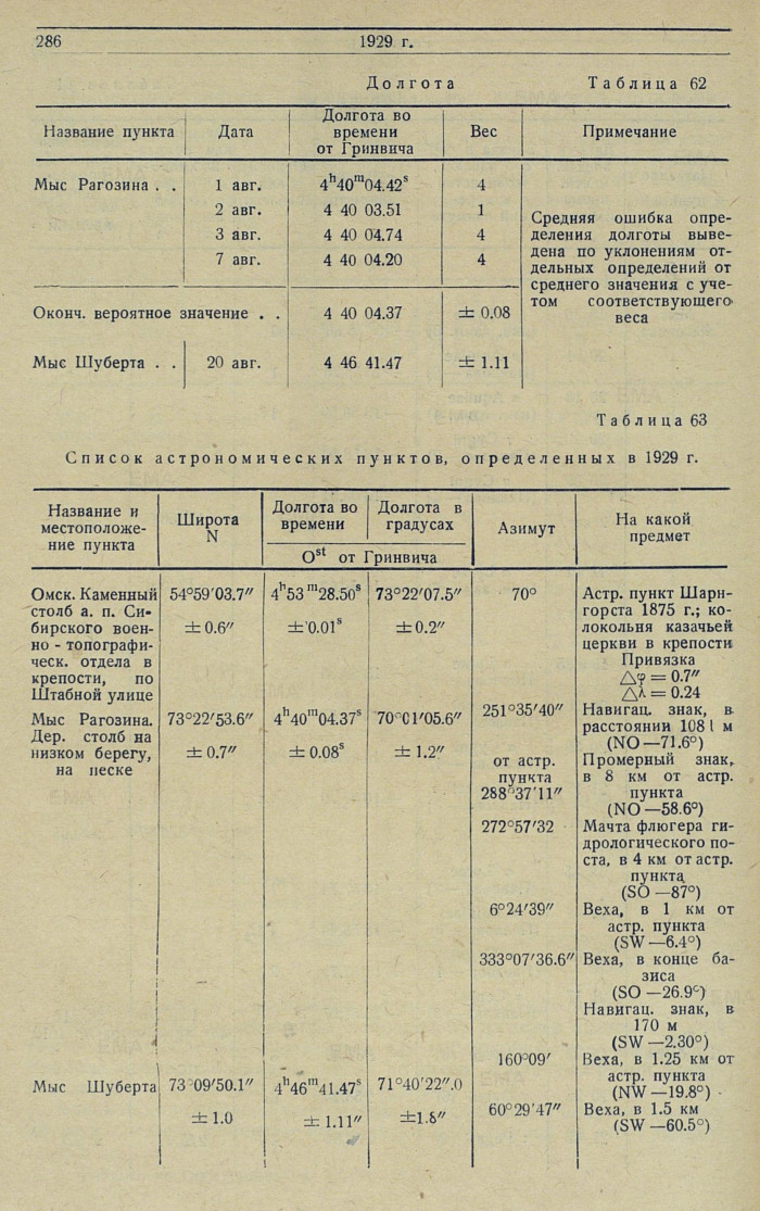 Исходными данными для первоначальных вычислений астрономического пункта на мысе Рагозина взяты координаты астропункта Ахматова 1904 г. 1 φ = 73°24.8', λ = 70°05.2'. Для вычислений пункта на мысе Шуберта приближенные координаты места наблюдений сняты с карты северной части Обской губы, изд. 1929 г., φ = 73°13', λ = 71°40'. Результаты вычисления широты, местного времени и долготы приводятся в таблицах 60, 61 и 62.