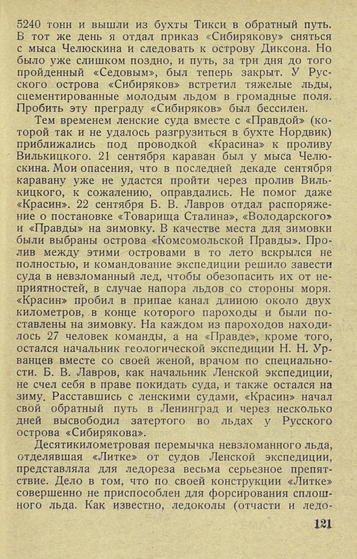 Тем временем ленские суда вместе с «Правдой» (которой так и не удалось разгрузиться в бухте Нордвик) приближались под проводкой «Красина» к проливу Вилькицкого. 21 сентября караван был у мыса Челюскина. Мои опасения, что в последней декаде сентября каравану уже не удастся пройти через пролив Вилькицкого, к сожалению, оправдались. Не помог даже «Красин». 22 сентября Б. В. Лавров отдал распоряжение о постановке «Товарища Сталина», «Володарского» и «Правды» на зимовку. В качестве места для зимовки были выбраны острова «Комсомольской Правды». Пролив между этими островами в то лето вскрылся не полностью, и командование экспедиции решило завести суда в невзломанный лед, чтобы обезопасить их от неприятностей, в случае напора льдов со стороны моря. «Красин» пробил в припае канал длиною около двух километров, в конце которого пароходы и были поставлены на зимовку. На каждом из пароходов находилось 27 человек команды, а на «Правде», кроме того, остался начальник геологической экспедиции H. Н. Урванцев вместе со своей женой, врачом по специальности. Б. В. Лавров, как начальник Ленской экспедиции, не счел себя в праве покидать суда, и также остался на зиму. Расставшись с ленскими судами, «Красин» начал свой обратный путь в Ленинград и через несколько дней высвободил затертого во льдах у Русского острова «Сибирякова».