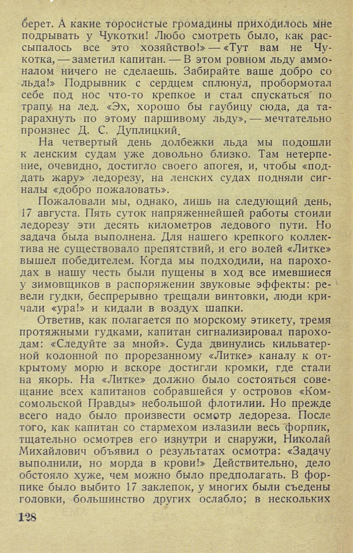 берет. А какие торосистые громадины приходилось мне подрывать у Чукотки! Любо смотреть было, как рассыпалось все это хозяйство! » — «Тут вам не Чукотка, — заметил капитан. — В этом ровном льду аммоналом ничего не сделаешь. Забирайте ваше добро со льда! » Подрывник с сердцем сплюнул, пробормотал себе под нос что-то крепкое и стал спускаться по трапу на лед. «Эх, хорошо бы гаубицу сюда, да тарарахнуть по этому паршивому льду», — мечтательно произнес Д. С. Дуплицкий.