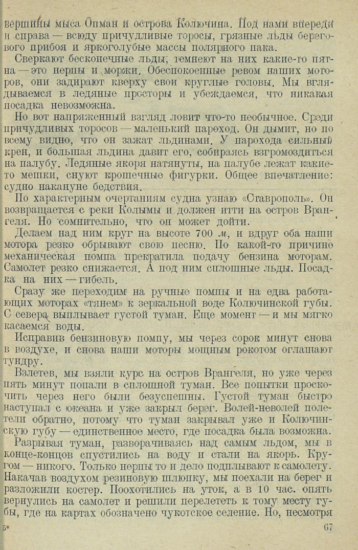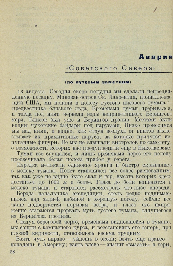 25 августа. Около двух часов дня, закусив и приготовив свои мешки, мы двинулись в путь. Наша верная птица, изломанная, исковерканная, отслужила свою службу. Еще недавно несла она нас над волнами Японского моря, над скалами Татарского пролива, над островом Сахалином, над вечными туманами Охотского моря, над снежными вершинами Камчатки. Колючинская губа, — последний этап. Здесь когда-то, в 1879 г., зимовала ,«Вега» — корабль Норденшельда, а теперь, пятьдесят лот спустя, появился и потерпел аварию наш советский самолет, впервые в истории человечества облетевший крайний север Союза.