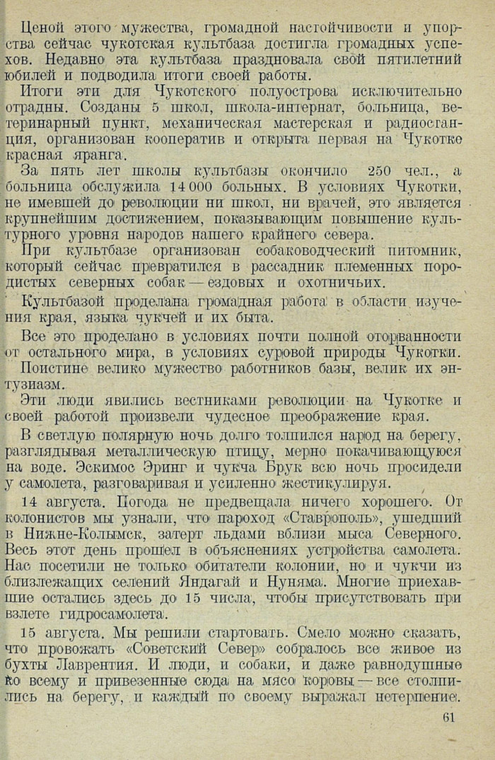 14 августа. Погода не предвещала ничего хорошего. От колонистов мы узнали, что пароход «Ставрополь», ушедший в Нижне-Колымск, затерт льдами вблизи мыса Северного. Весь этот день прошел в объяснениях устройства самолета. Нас посетили не только обитатели колонии, но и чукчи из близлежащих селений Яндагай и Нуняма. Многие приехавшие остались здесь до 15 числа, чтобы присутствовать при взлете гидросамолета.