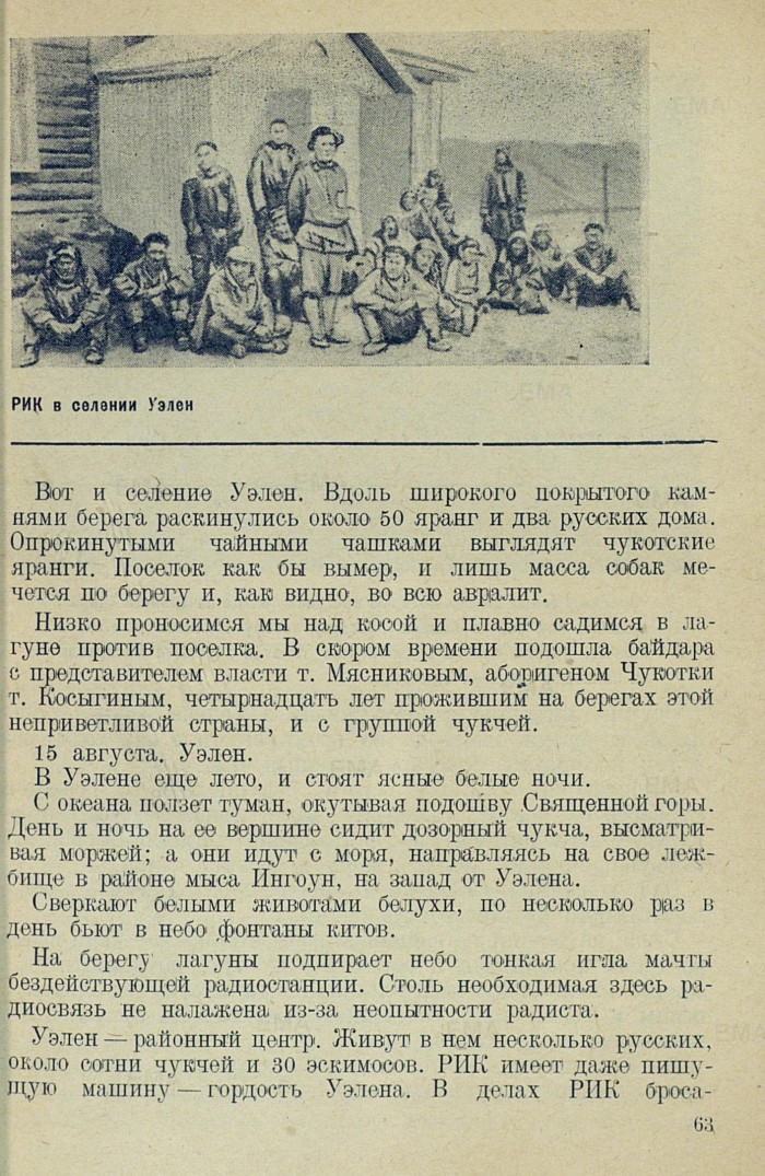 Уэлен — районный центр. Живут в нем несколько русских, около сотни чукчей и 30 эскимосов. РИК имеет даже пишущую машину — гордость Уэлена. В делах РИК броса-