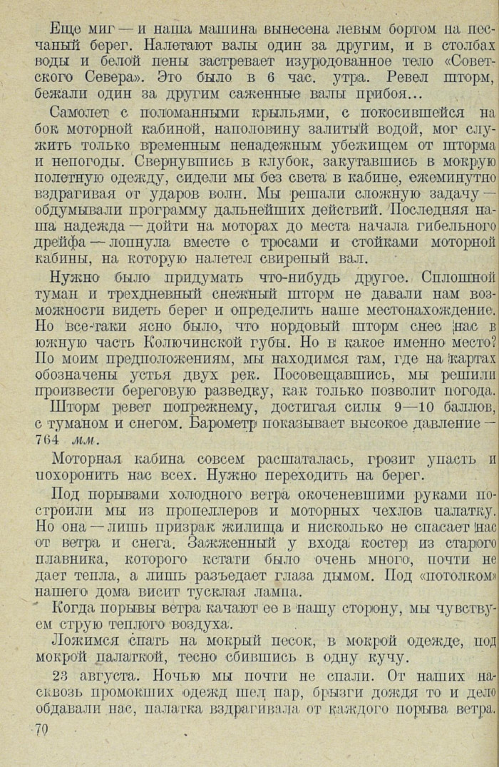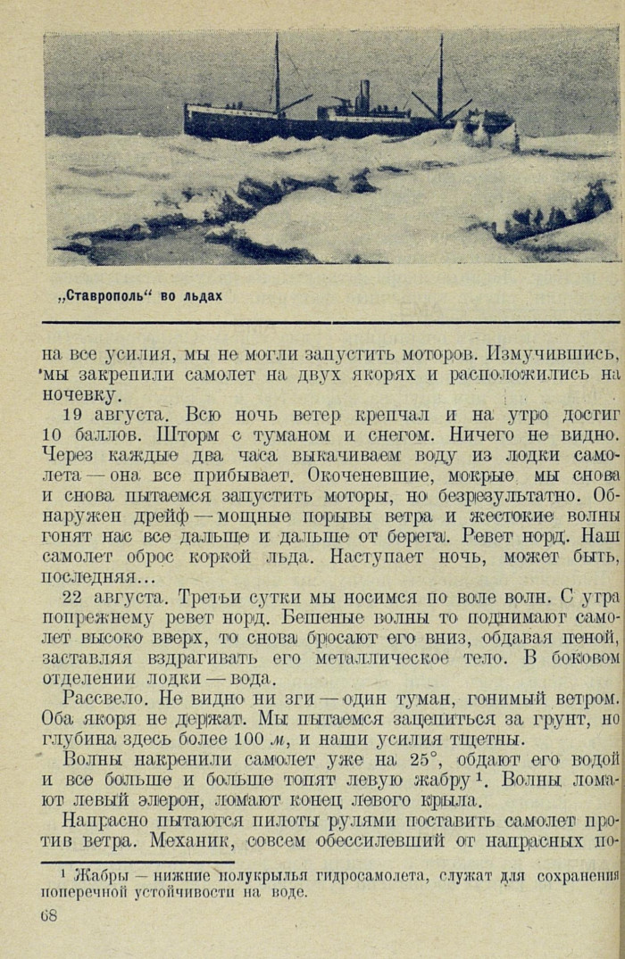 19 августа. Всю ночь ветер крепчал и на утро достиг 10 баллов. Шторм с туманом и снегом. Ничего не видно. Через каждые два часа выкачиваем воду из лодки самолета — она все прибывает. Окоченевшие, мокрые мы снова и снова пытаемся запустить моторы, но безрезультатно. Обнаружен дрейф — мощные порывы ветра и жестокие волны гонят нас все дальше и дальше от берега. Ревет норд. Наш самолет оброс коркой льда. Наступает ночь, может быть, последняя...