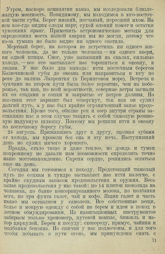 Сегодня мы готовимся к походу. Предстоящий тяжелый путь по сопкам и тундре заставляет нас итти налегке, с крайне скудным запасом продовольствия и оружия. Весь запас продовольствия у нас такой: по 14 плиток шоколада на человека, по банке консервированного молока, по полбанки эгго, по три фунта галет, чай и кофе. Ящик галет и часть какао мы оставляем у самолета. Все собственные вещи, белье и мокрую одежду с собой не берем и идем в поход в летном обмундировании. Из навигационных инструментов забираем только хронометр, путевой компас, бинокль и набор циркулей. Берем и посуду: сковороду, примус, чайник и полбанки бензина. Но спички у нас подмочены, и для того чтобы добывать в пути огонь, мы принуждены снять с