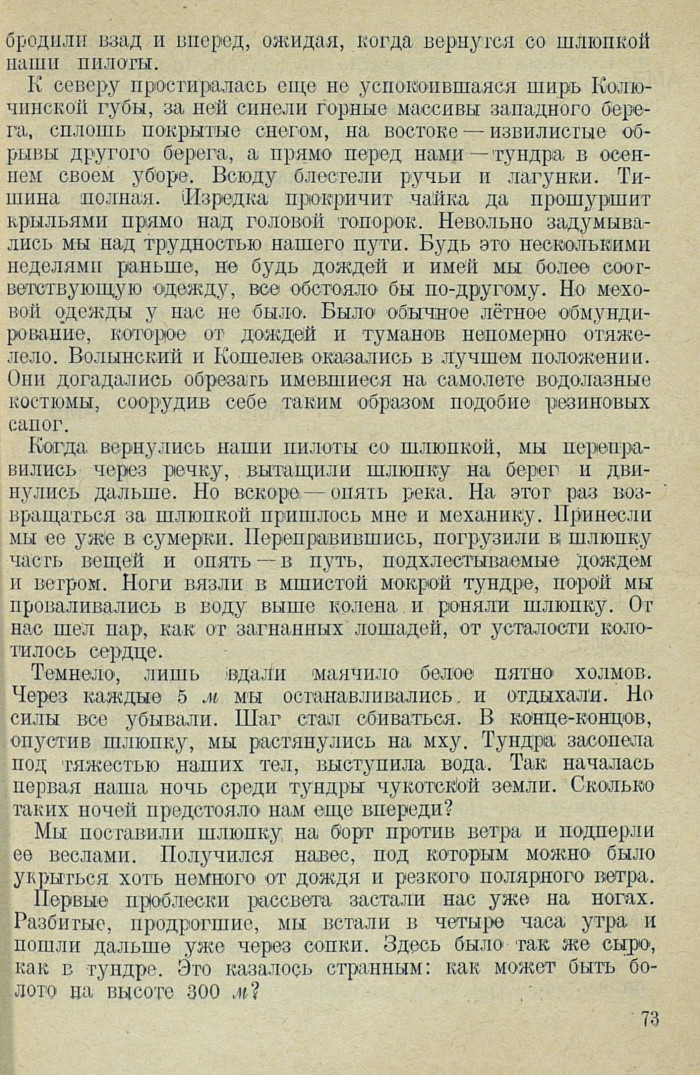 К северу простиралась еще не успокоившаяся ширь Колючинской губы, за ней синели горные массивы западного берега, сплошь покрытые снегом, на востоке — извилистые обрывы другого берега, а прямо перед нами — тундра в осеннем своем уборе. Всюду блестели ручьи и лагунки. Тишина полная. Изредка прокричит чайка да прошуршит крыльями прямо над головой топорок. Невольно задумывались мы над трудностью нашего пути. Будь это несколькими неделями раньше, не будь дождей и имей мы более соответствующую одежду, все обстояло бы по-другому. Но меховой одежды у нас не было. Было обычное лётное обмундирование, которое от дождей и туманов непомерно отяжелело. Волынский и Кошелев оказались в лучшем положении. Они догадались обрезать имевшиеся на самолете водолазные костюмы, соорудив себе таким образом подобие резиновых сапог.