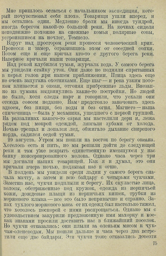 Над рекой клубился туман, журчала вода. У самого берега мы увидели стайку уток. Они даже не подняли спрятанных в перья голов при нашем приближении. Птица здесь еще не очень запугана охотниками. Еще шаг — и река узким потоком вливается в океан, отгоняя прибрежные льды. Внезапно из тумана выдвинулись какие-то постройки. Но людей не было, хотя следы нарт и говорили, что уехали они отсюда совсем недавно. Нам предстояло заночевать здесь вдвоем, без пищи, без воды и без огня. Магнето — наша спичечница — была у механика, ушедшего с первой группой. На развалинах какого-то сарая мы настелили дерн и, лежа рядом под мокрой одеждой, лязгали зубами от холода. Ночью трещал и лопался лед, обжигало дыхание свирепого норда, садился седой туман.