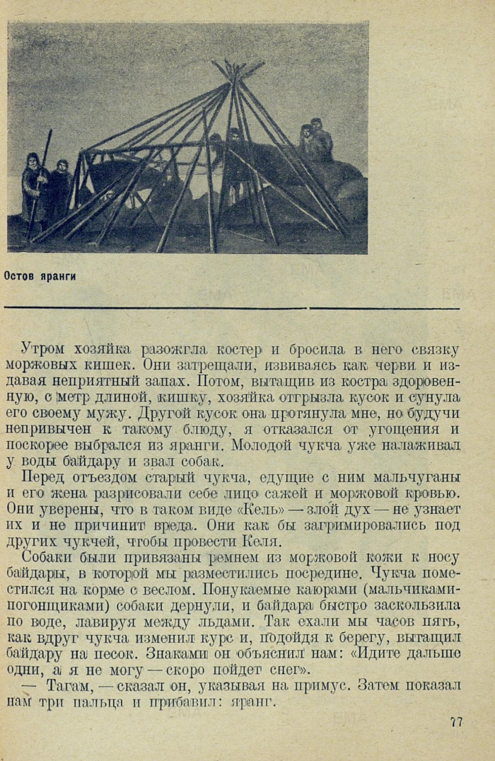 Утром хозяйка разожгла костер и бросила в него связку моржовых кишок. Они затрещали, извиваясь как черви и издавая неприятный запах. Потом, вытащив из костра здоровенную, с метр длиной, кишку, хозяйка отгрызла кусок и сунула его своему мужу. Другой кусок она протянула мне, но будучи непривычен к такому блюду, я отказался от угощения и поскорее выбрался из яранги. Молодой чукча уже налаживал у воды байдару и звал собак.
