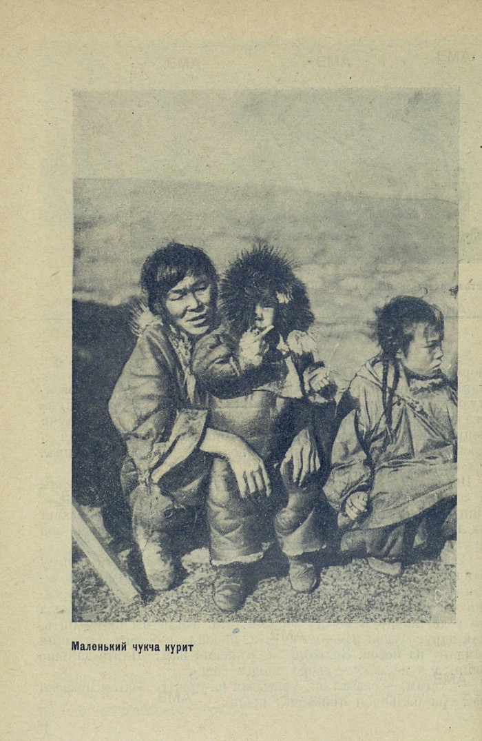 На другой день, сидя у очага, мы жарили лепешки на нерпичьем жиру, а рядом с нами хозяйка яранги варила в котле моржовое мясо. Тут же кем-то обиженный мальчуган лег пяти горько плакал, размазывая кулачками по лицу грязь. Потом, не дав высохнуть слезам, он достал трубку и кисет и закурил, важно пуская облака едкого дыма. Чукчи курят все поголовно чуть ли не с пеленок.