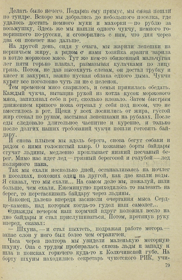 Делать было нечего. Подарив ему примус, мы снова пошли но тундре. Вскоре мы добрались до небольшого поселка, где удалось достать немного муки и махорки —по рублю за восьмушку. Здесь же мы нашли одного чукчу, немного говорившего по-русски, и сговорились с ним, что дня через два он повезет нас дальше.