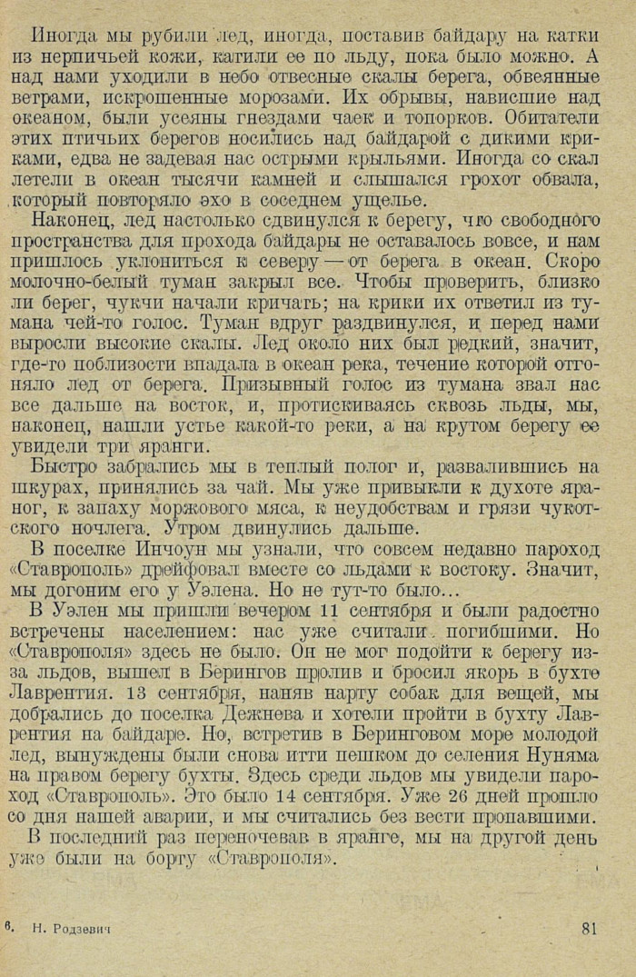 В Уэлен мы пришли вечером 11 сентября и были радостно встречены населением: нас уже считали погибшими. Но «Ставрополя» здесь не было. Он не мог подойти к берегу из-за льдов, вышел в Берингов пролив и бросил якорь в бухте Лаврентия. 13 сентября, наняв нарту собак для вещей, мы добрались до поселка Дежнева и хотели пройти в бухту Лаврентия на байдаре. Но, встретив в Беринговом море молодой лед, вынуждены были снова итти пешком до селения Нуняма на правом берегу бухты. Здесь среди льдов мы увидели пароход «Ставрополь». Это было 14 сентября. Уже 26 дней прошло со дня нашей аварии, и мы считались без вести пропавшими.