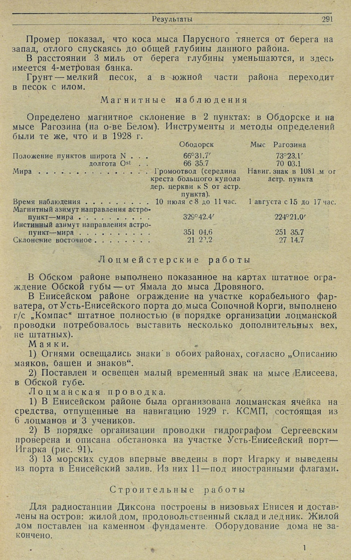 Определено магнитное склонение в 2 пунктах: в Обдорске и на мысе Рагозина (на о-ве Белом). Инструменты и методы определений были те же, что и в 1928 г.
