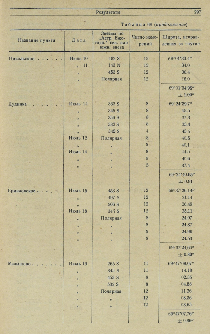 Определение широты. Определение широты, как указано, производилось по измерениям близмеридианальных зенитных расстояний северных и южных звезд. Обычно наблюдалось 6—7 звезд, причем у каждой звезды зенитное расстояние измерялось в среднем 12 раз, симметрично при разных положениях вертикального круга. Вычисления широты сделаны по обычным формулам. Гнутие трубы выводилось для каждого пункта в отдельности.