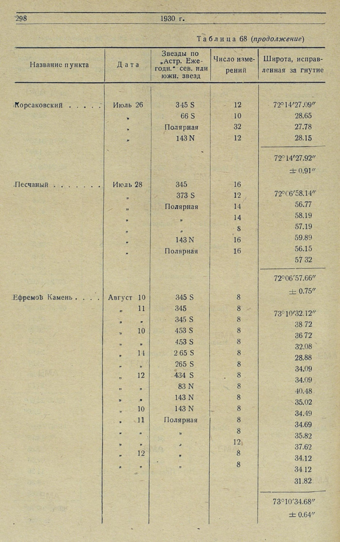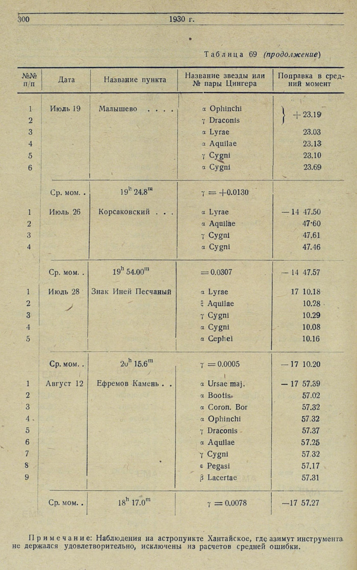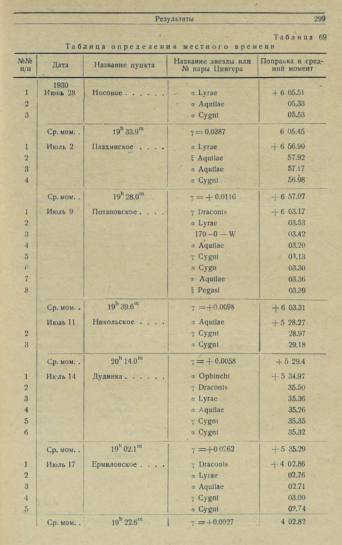 Определение долготы. Ha 11 экспедиционных пунктах 1930 г. поправка рабочего хронометра относительно местного звездного времени определялась по 68 звездам, большей частью по способу Павлова. Результаты сведены в табл. 69.