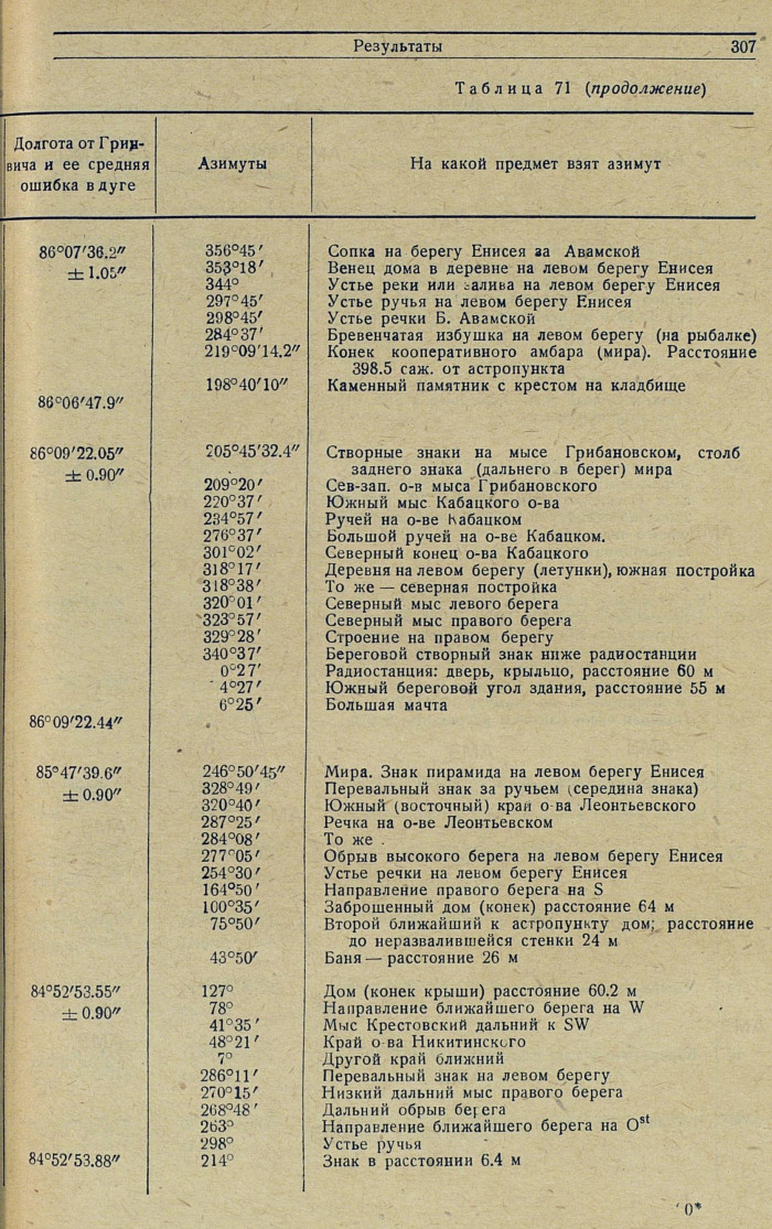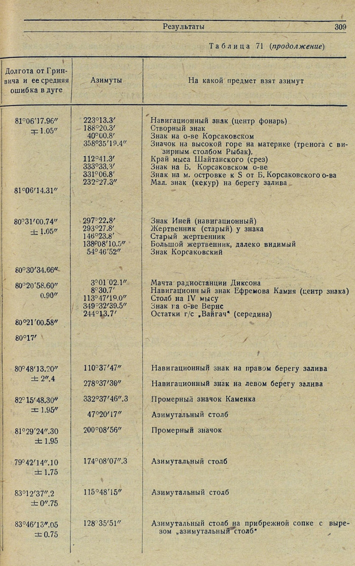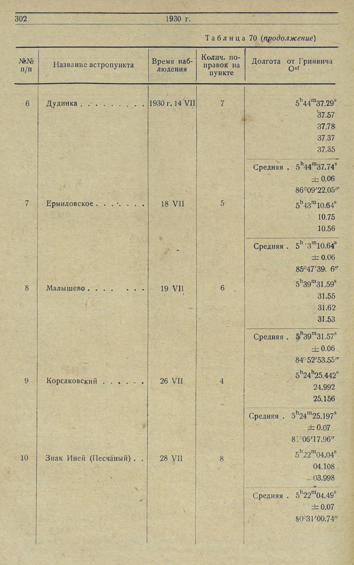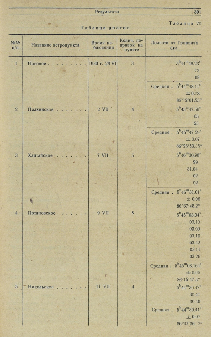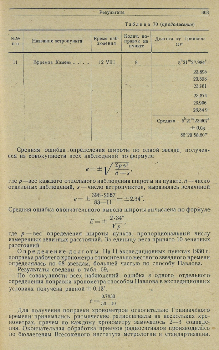 В таблице 70 (долгот) сведены все полученные независимые значения долгот экспедиционных пунктов.