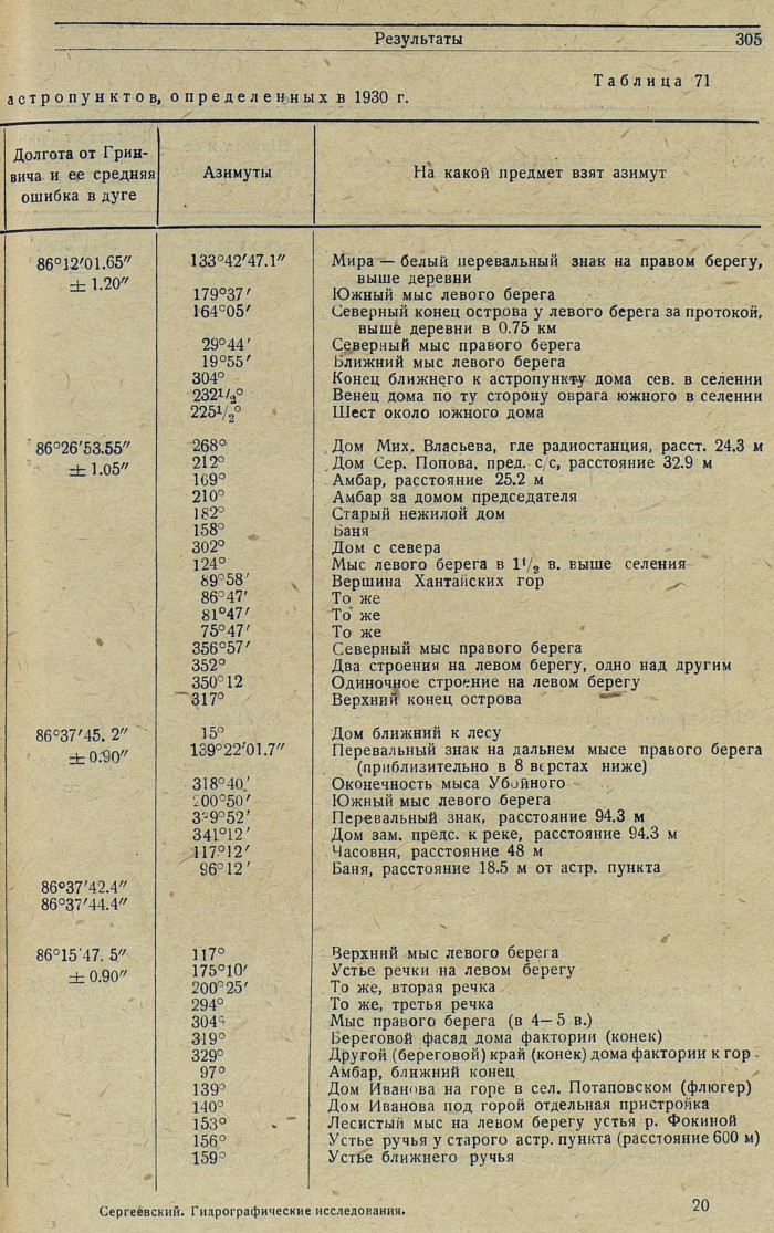 Сводная таблица координат астропунктов, определенных в 1930 г.