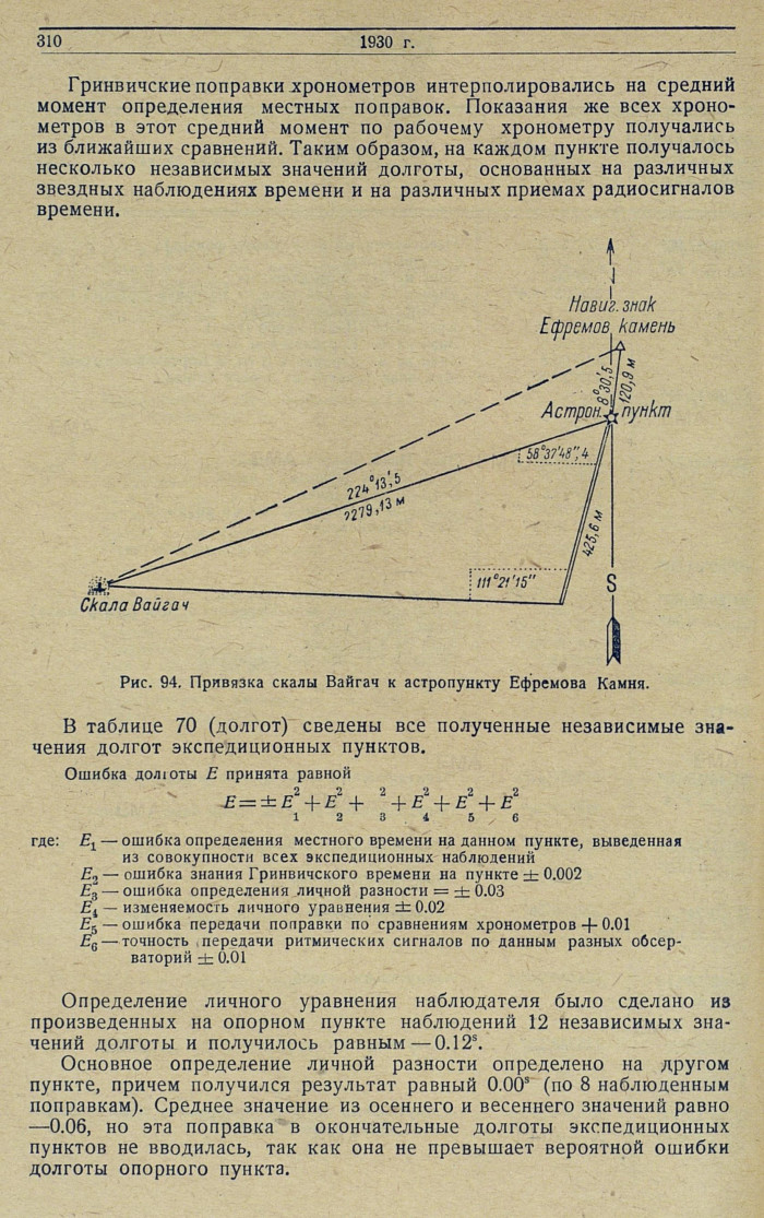 Основное определение личной разности определено на другом пункте, причем получился результат равный 0. 00s (по 8 наблюденным поправкам). Среднее значение из осеннего и весеннего значений равно — 0. 06, но эта поправка в окончательные долготы экспедиционных пунктов не вводилась, так как она не превышает вероятной ошибки долготы опорного пункта.