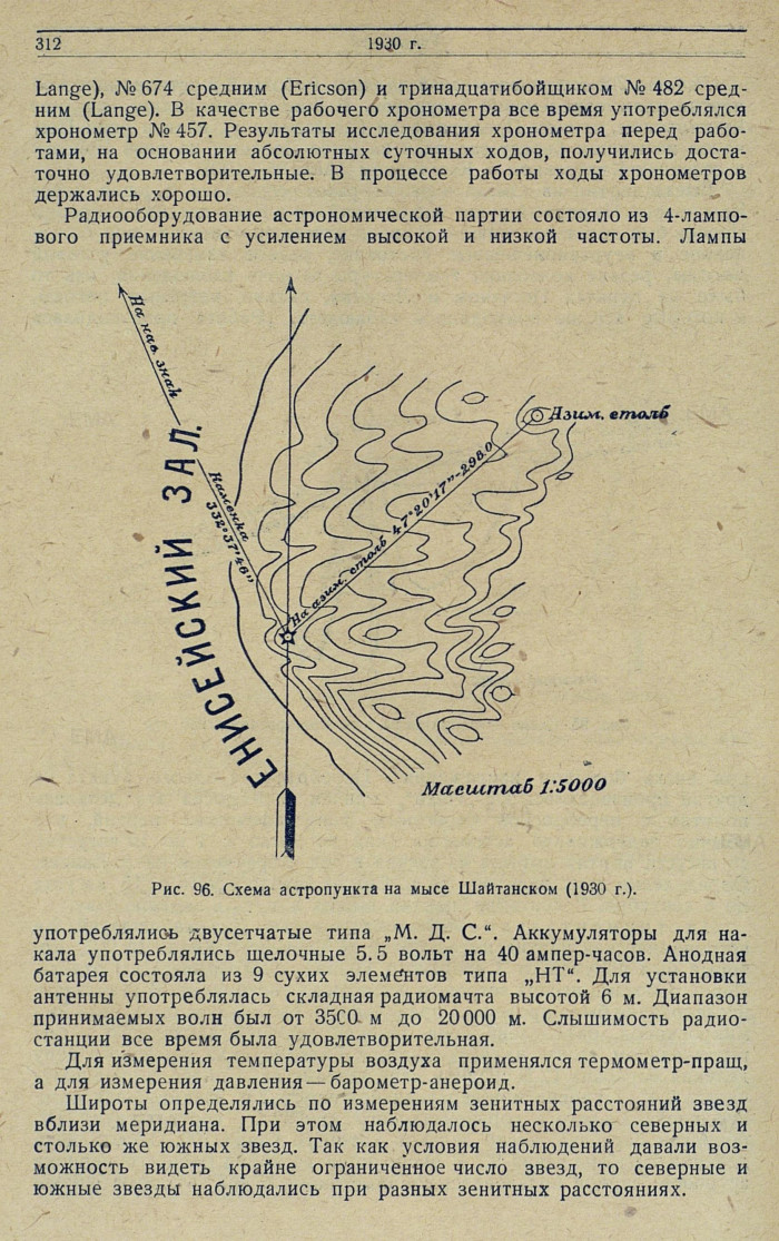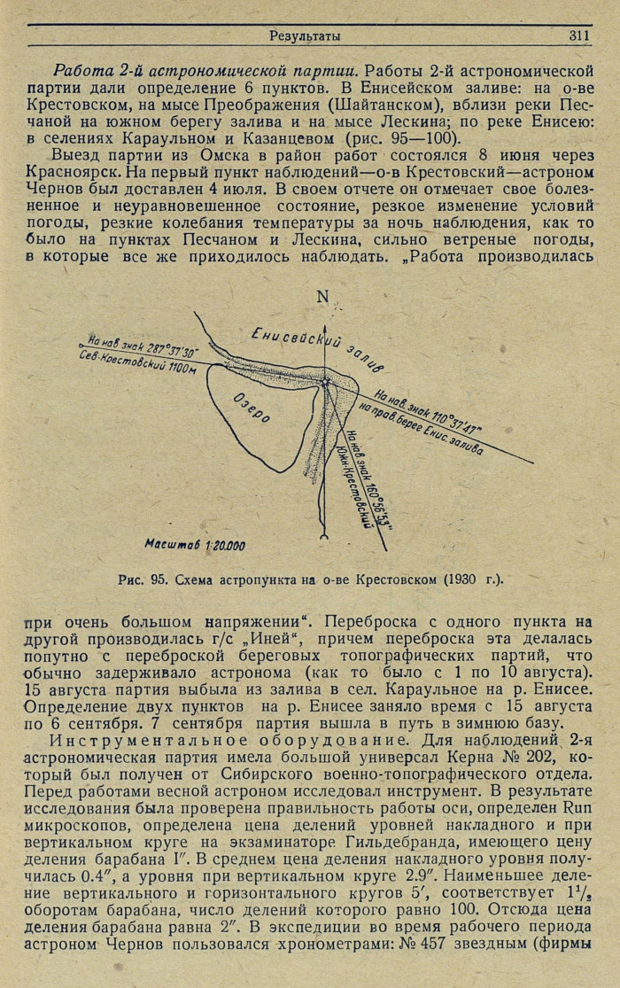 Работы 1-й астрономической партии. Астрономом Воробьевым в 1930 г. было определено 8 астрономических пунктов на р. Енисее и 3 пункта в Енисейском заливе.