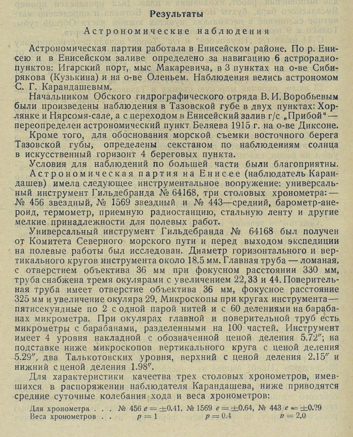 РезультатыАстрономические наблюденияАстрономическая партия работала в Енисейском районе. По р. Енисею и в Енисейском заливе определено за навигацию 6 астрорадиопунктов: Игарский порт, мыс Макаревича, в 3 пунктах на о-ве Сибирякова (Кузькина) и на о-ве Оленьем. Наблюдения велись астрономом С. Г. Карандашевым.