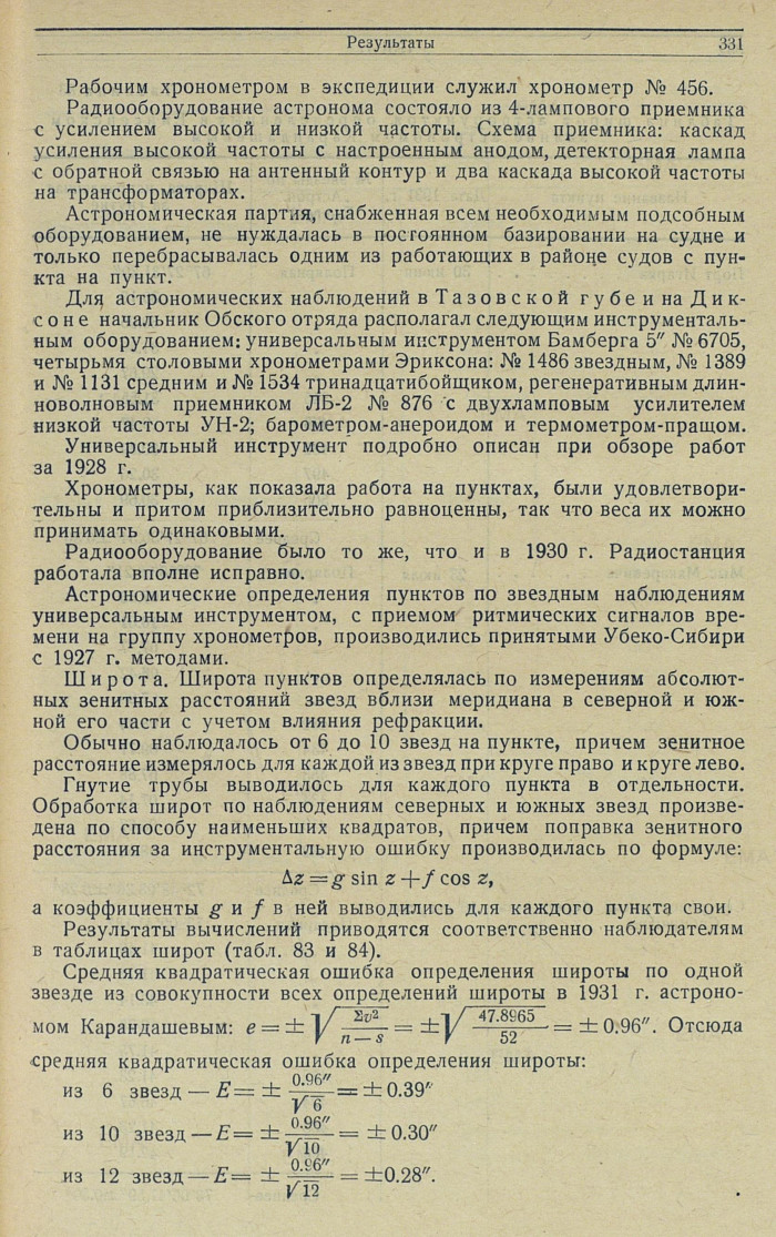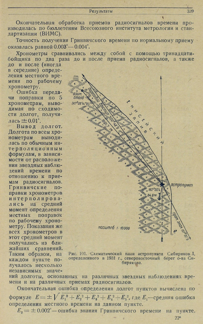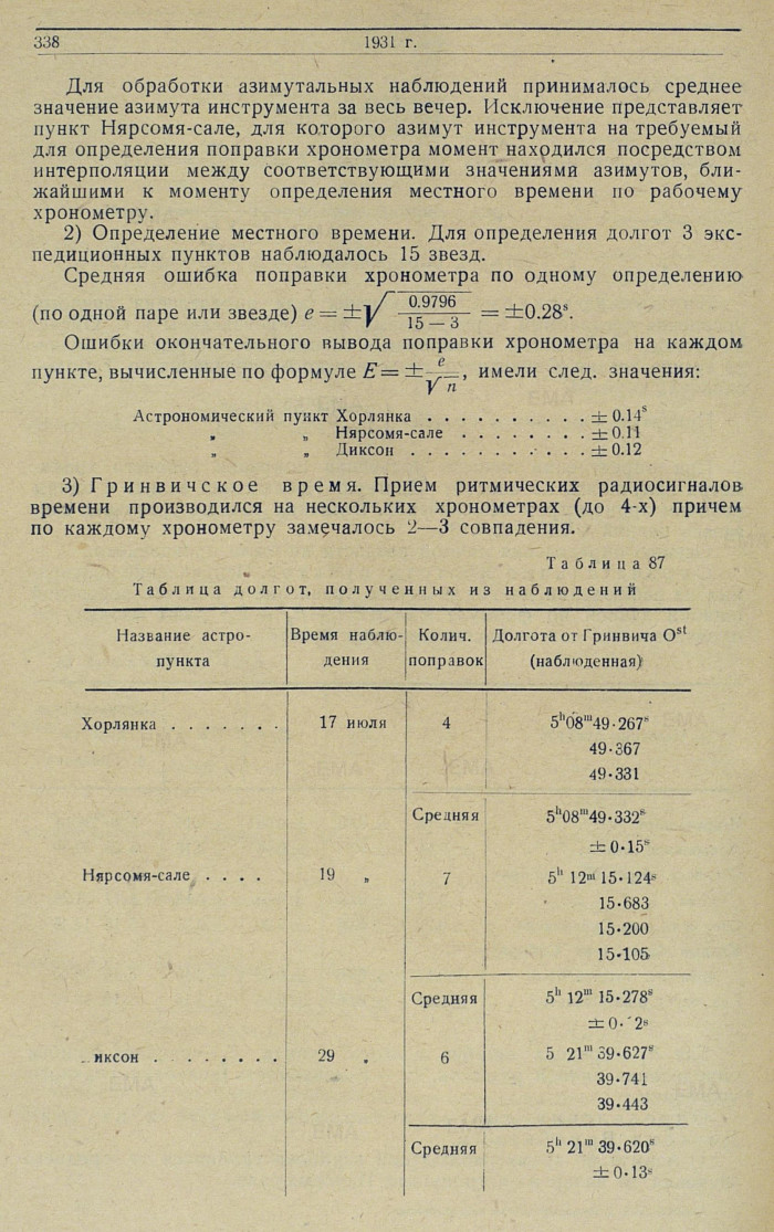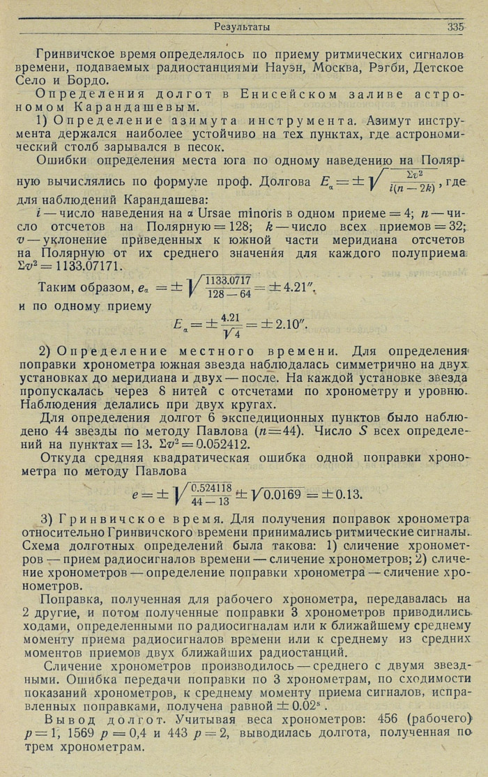 Долгота по всем хронометрам выводилась по обычным интерполяционным формулам, в зависимости от расположения звездных наблюдений времени по отношению к приемам радиосигналов.