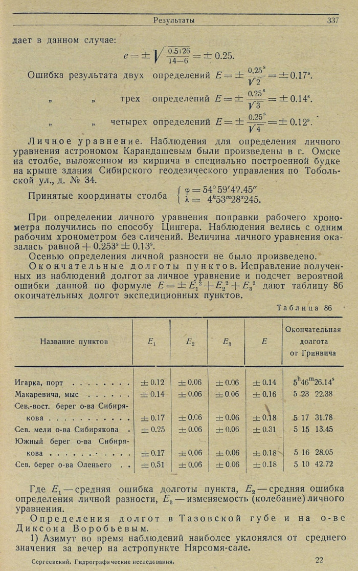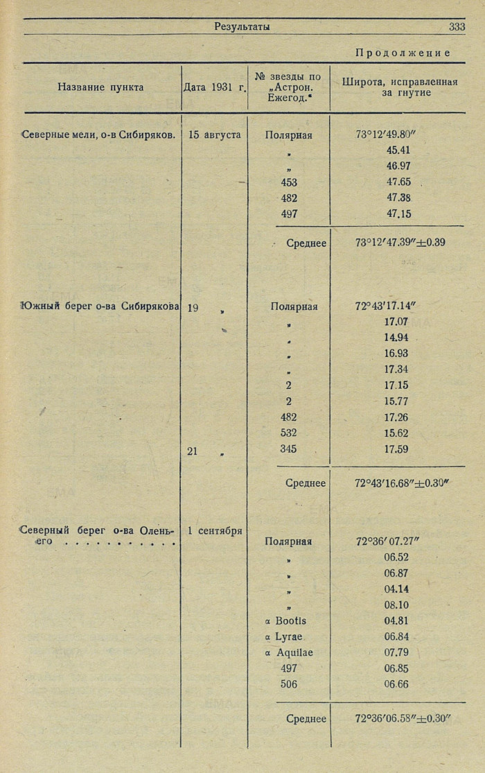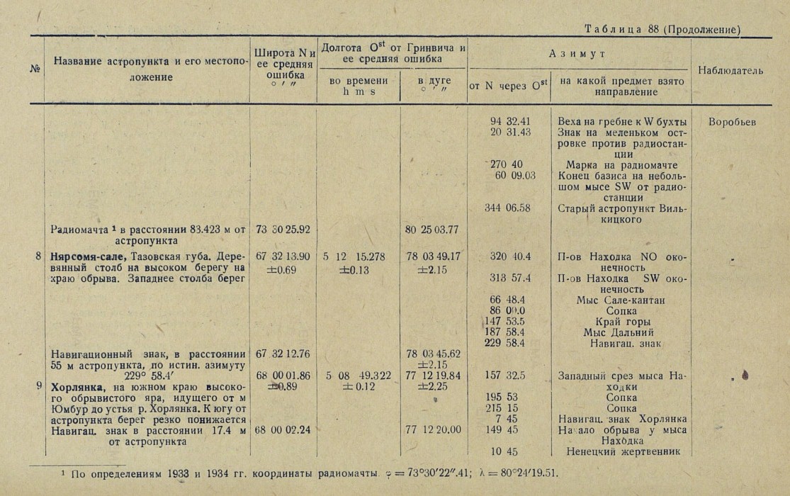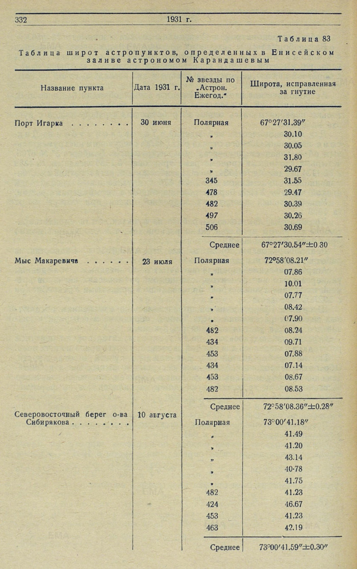 {1} Из ряда последующих определений астрономов Воробьева, Карандашева, Чернова и Лейзенберга 1933 и 1834 гг. координаты астростолба (Беляева) на метеорологической площадке станции Диксона: φ = 73°30'22.45; λ = 80°24'10".0.