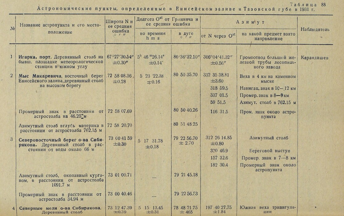 Астрономические пункты, определенные в Енисейском заливе и Тазовской губе в 1931 г.