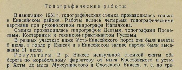 В навигацию 1931 г. топографическая съемка производилась только в Енисейском районе. Работы велись четырьмя топографическими партиями под руководством гидрографа Напалкова.