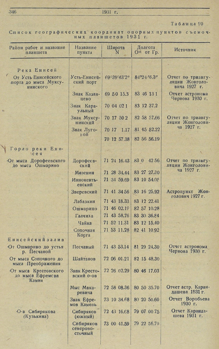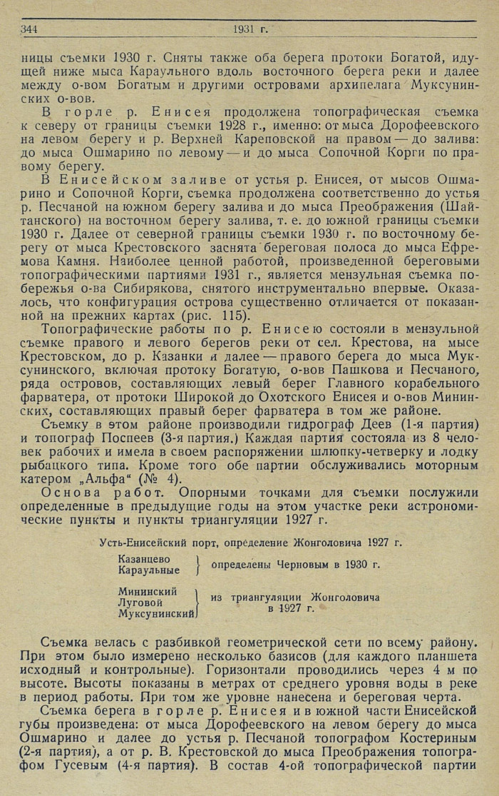 Работами 1931 г. закончена начатая в 1928 г. мензульная съемка низовьев р. Енисея от Усть-Енисейского порта до Енисейского залива. Таким образом получен полный картографический материал для издания новых карт этого района. На имевшихся ранее картах берега на этом участке р. Енисея были положены по теодолитной съемке 1911—1913 гг. Гл. управления земледелия и государственного имущества (землемеров Мезенина и Солдатова) и только острова были положены по дополнительной съемке 1920—1921—1922 гг. гидрографа Таушканова, также теодолитной (обходом).