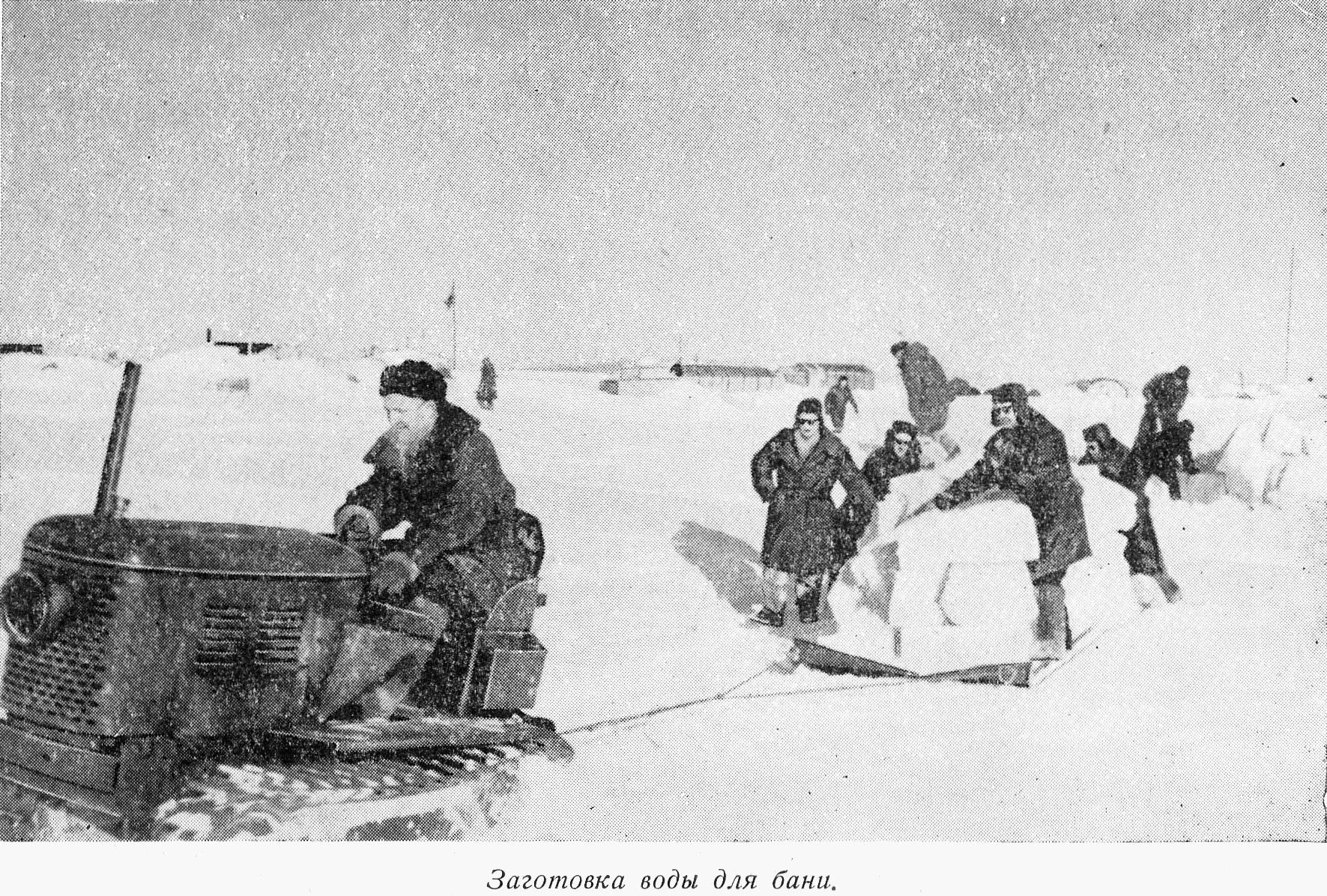В банный день еще задолго до завтрака из трубы над баней поднимаются густые клубы дыма. Это стараются дежурные по бане (их всегда двое). Работы хватает: в одном из сугробов вблизи станции нужно напилить ножовкой кубы снега, каждый весом минимум 15—20 кг (а снег плотный, еле ножовка врезается), затем эти кубы надо подтащить на волокуше к бане, рядом с которой стоит сделанная из бочки снеготаялка; после этого надо «делать» из снега горячую воду. Нагретую воду помпой перекачивают в бочки, находящиеся в бане.