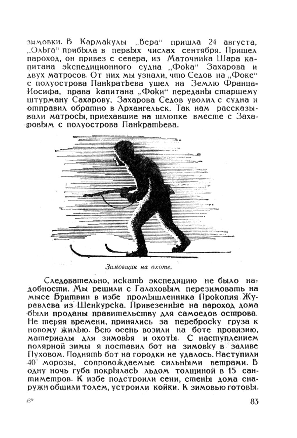 зимовки. В Кармакулы "Вера" пришла 24 августа, "Ольга" прибыла в первых числах сентября. Пришел пароход, он привез с севера, из Маточника Шара капитана экспедиционного судна "Фока" Захарова и двух матросов. От них мы узнали, что Седов на "Фоке" с полуострова Панкратьева ушел на Землю Франца-Иосифа, права капитана "Фоки" переданы старшему штурману Сахарову. Захарова Седов уволил с судна и отправил обратно в Архангельск. Так нам рассказывали матросы, приехавшие на шлюпке вместе с Захаровым с полуострова Панкратьева.