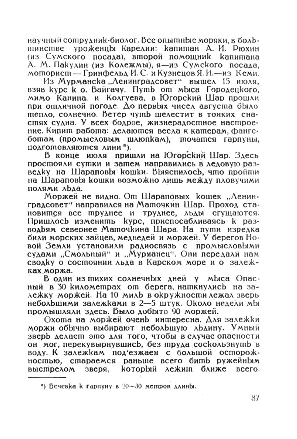 ЗА МОРЖАМИВ июле 1932 года по приглашению Ленгосторга *) я выехал на зверобойный промысел в Карское море. Судно "Ленинградсовет", на котором мы шли на промысел, было построено в Норвегии и оборудовано по последнему слову техники. "Ленинградсовет" был вполне приспособлен к дальнему плаванию. Радио, электричество, машина для подъема якорей и зверя — все это облегчало работу зверобоя на море. В составе экипажа 7 человек судовой команды, 12 зверобоев и
