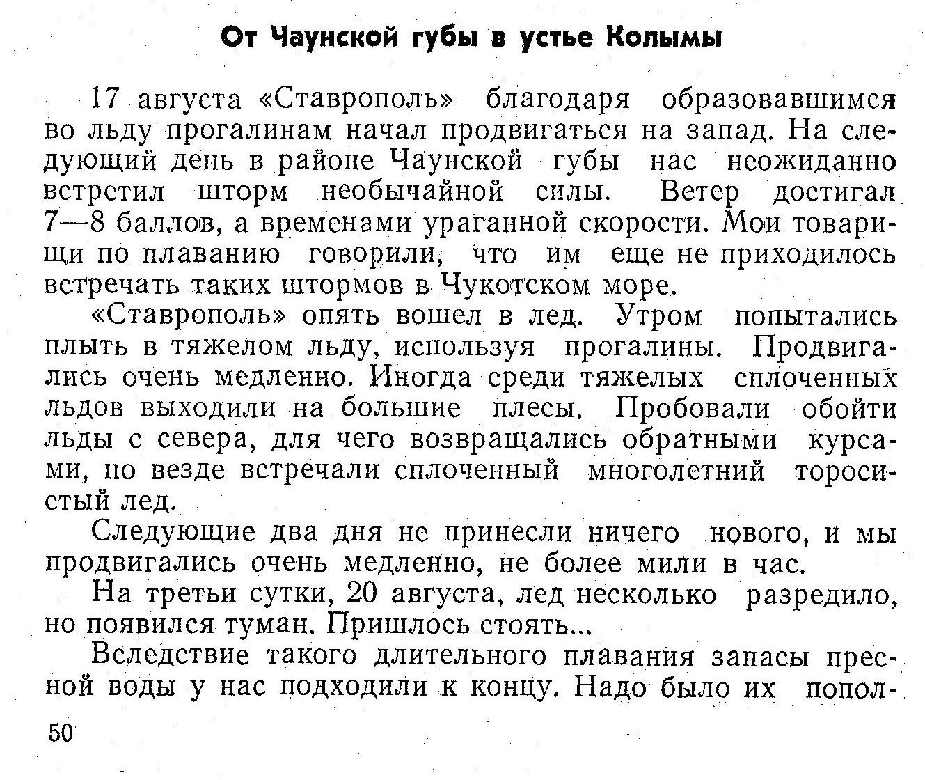 17 августа «Ставрополь» благодаря образовавшимся во льду прогалинам начал продвигаться на запад. На следующий день в районе Чаунской губы нас неожиданно встретил шторм необычайной силы. Ветер достигал 7—8 баллов, а временами ураганной скорости. Мои товарищи по плаванию говорили, что им еще не приходилось встречать таких штормов в Чукотском море.