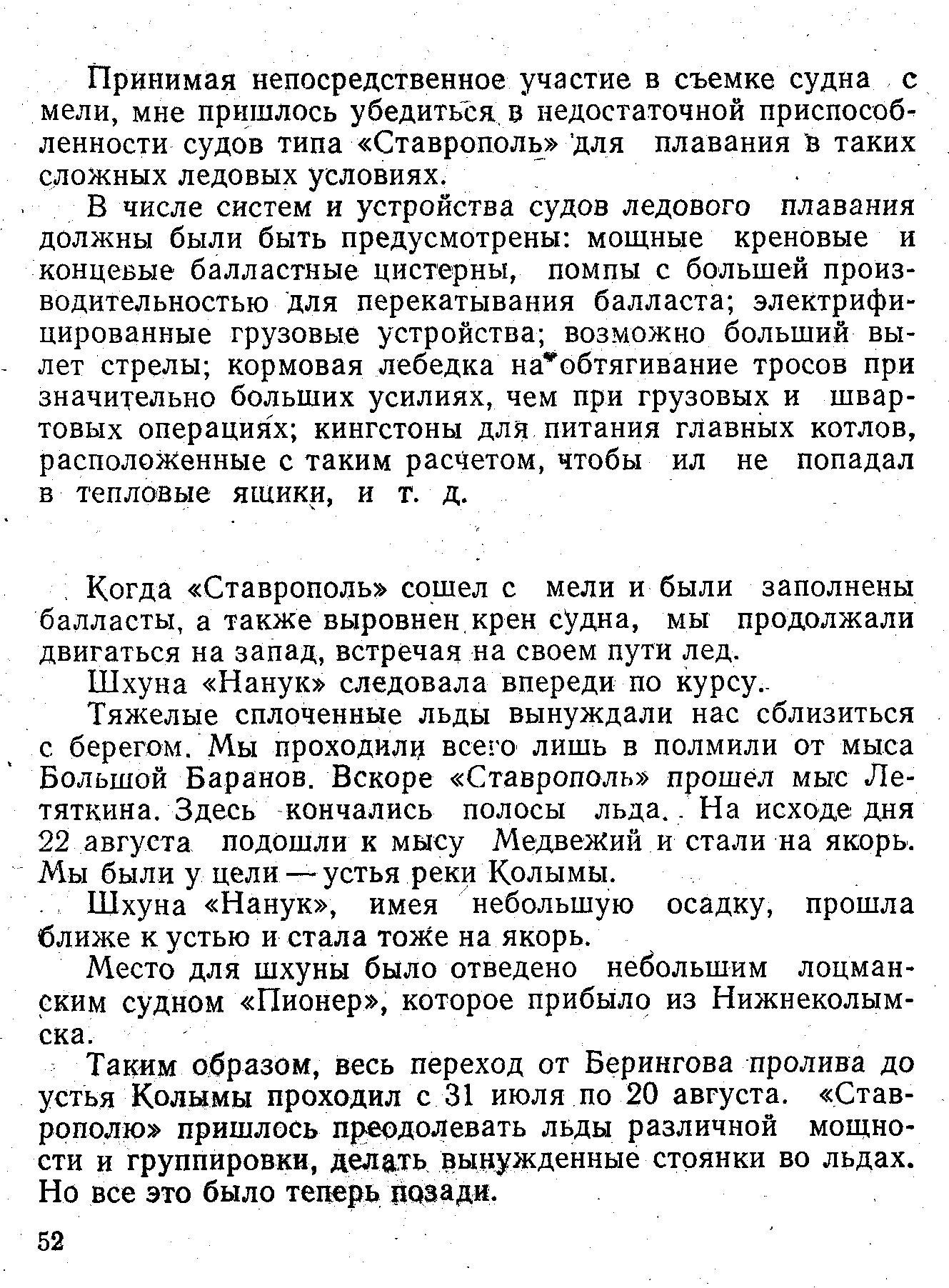 Около полудня 21 августа в поисках прохода - среди тяжелых льдов «Ставрополь», огибая большое ледяное поле, шел самым малым ходом вблизи берега. Ручным лотом постоянно определяли глубину — она была не ниже 28 футов. И вдруг неожиданно мы сели на мель. Пришлось снова заводить якоря. С помощью шлюпки завели ледовый якорь на большую льдину, осевшую на мели. Используя все имеющиеся у нас средства — верп, ледовый якорь, кренование, а также работая переменными ходами главной машины, начали сниматься с мели. На это ушло около 10—11 часов.