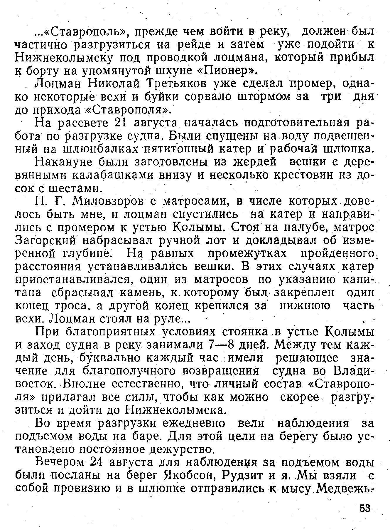 ... «Ставрополь», прежде чем войти в реку, должен был частично разгрузиться на рейде и затем уже подойти к Нижнеколымску под проводкой лоцмана, который прибыл к борту на упомянутой шхуне «Пионер».
