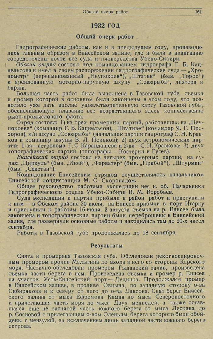 Общее руководство работами экспедиции нес и. об. Начальника Гидрографического отдела Убеко-Сибири В. М. Воробьев.