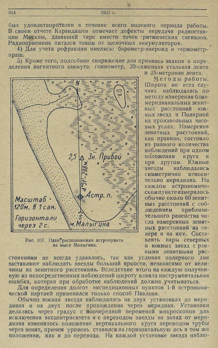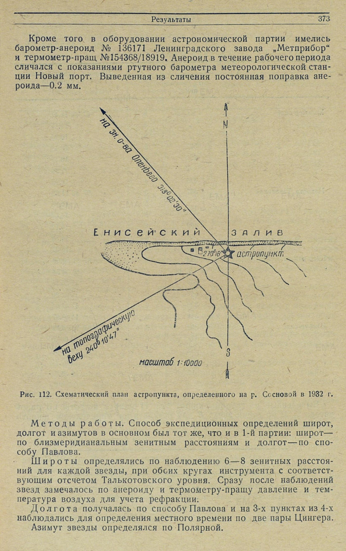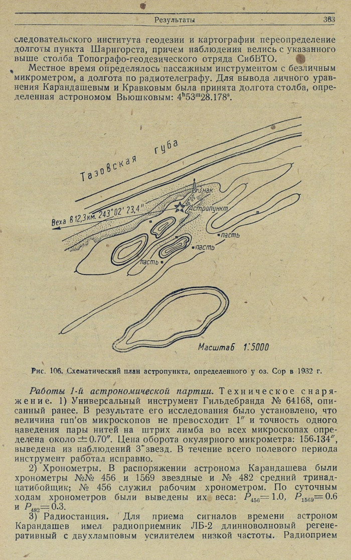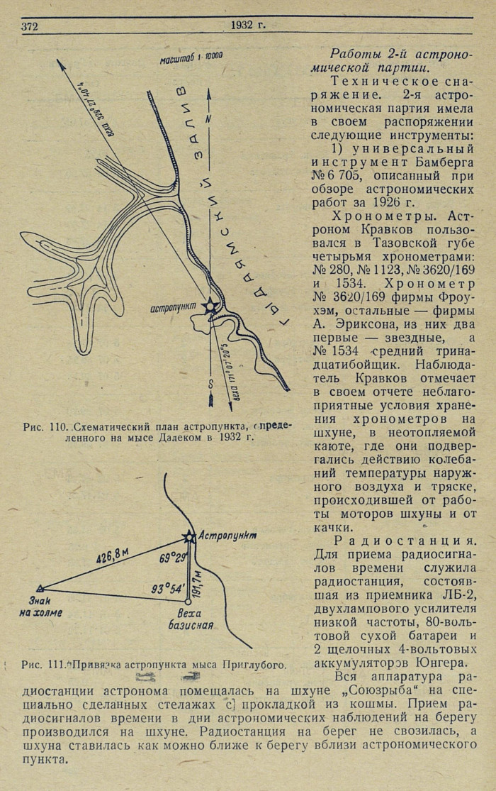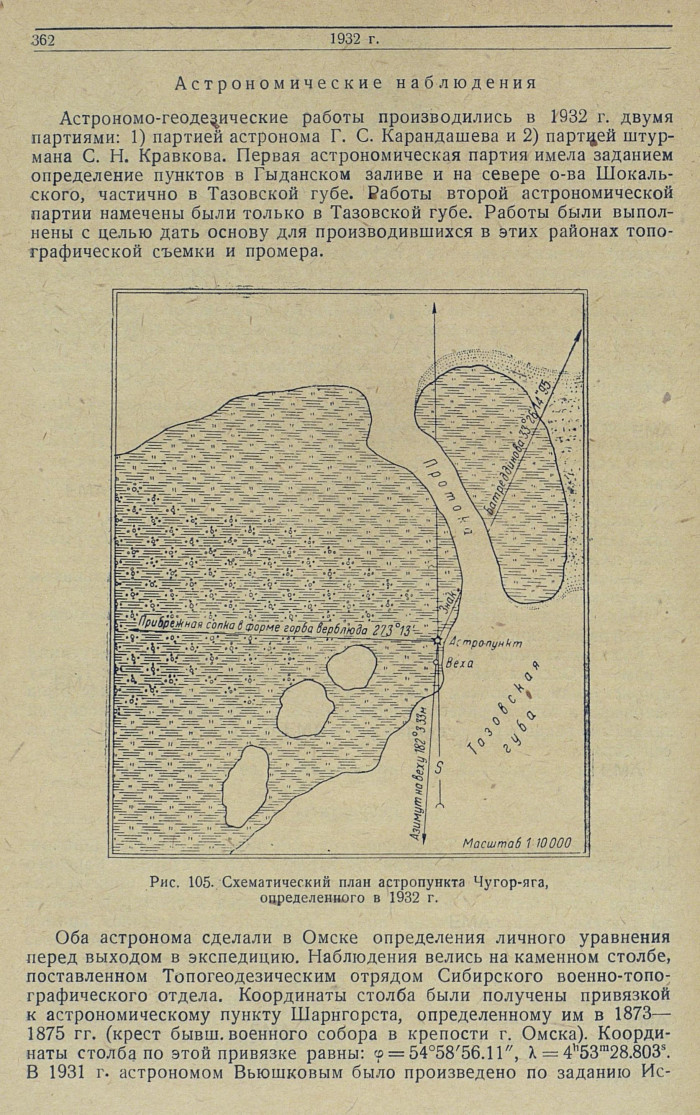 Астрономические наблюденияАстрономо-геодезические работы производились в 1932 г. двумя партиями: 1) партией астронома Г. С. Карандашева и 2) партией штурмана