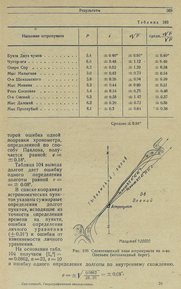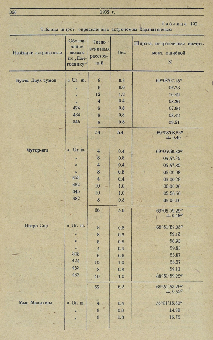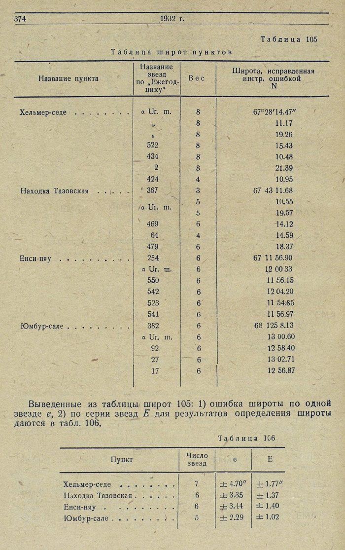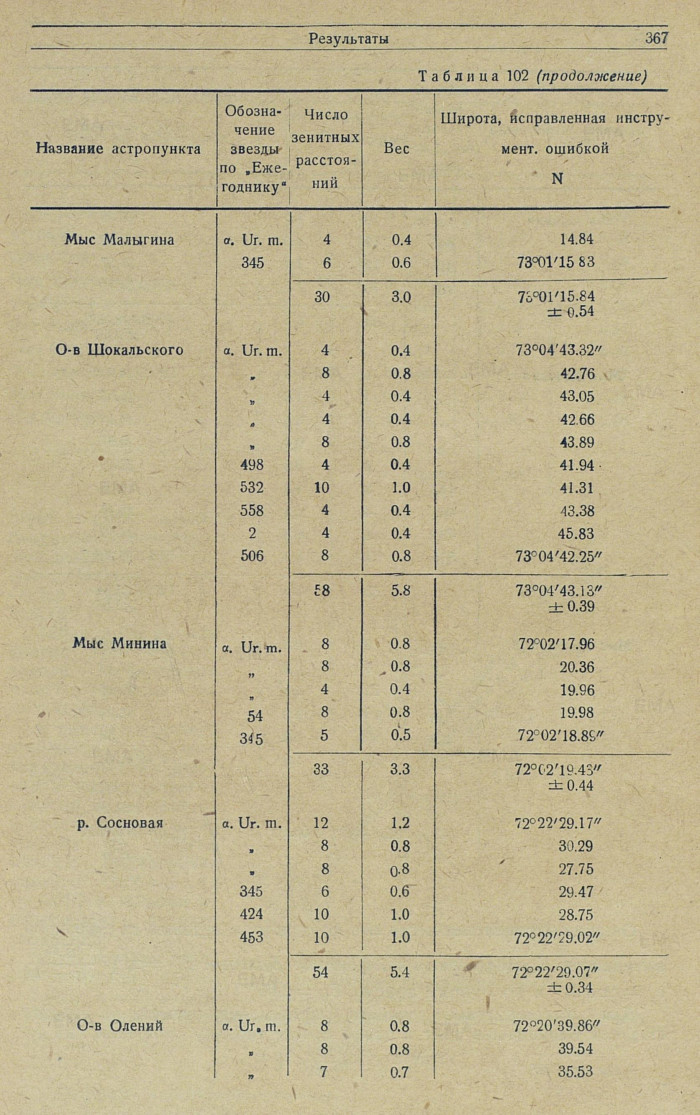 В таблице 102 средние ошибки широт пунктов даны по сходимости результатов на каждом пункте в отдельности. В окончательном списке координат астрономических пунктов будут указаны величины ошибок, полученных из всей совокупности широтных определений в течение всего полевого периода и данных в сводной табл. 103.