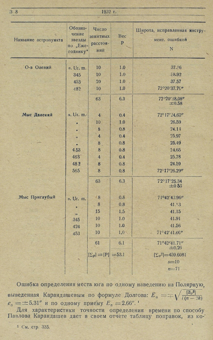 Методы работы. Широта во всех случаях наблюдалась по· методу измерения близмеридианальных зенитных расстояний южных звезд и Полярной на произвольных часовых углах. Измерение зенитных расстояний, как правило, состояло из равного количества наблюдений при одном положении круга и при другом. Южные звезды наблюдались симметрично относительно меридиана. На каждом астрономическом пункте измерялось обычно около 60 зенитных расстояний с соблюдением приблизительного равенства числа измеренных зенитных расстояний на севере и на юге. Составлять пары северных и южных звезд с равными зенитными расстояниями не всегда удавалось, так как условия полярного дня заставляют наблюдать звезды большой яркости, независимо от величины их зенитного расстояния. Вследствие этого на каждую полученную из непосредственных наблюдений широту влияла инструментальная ошибка, которая при обработке наблюдений должна учитываться.
