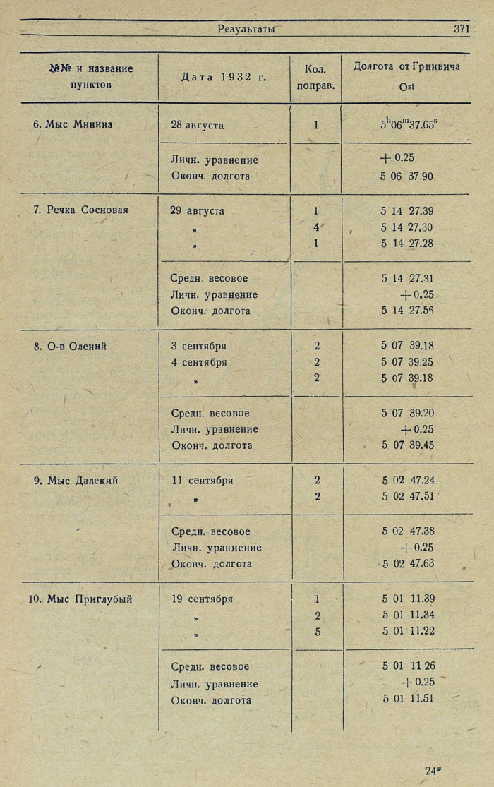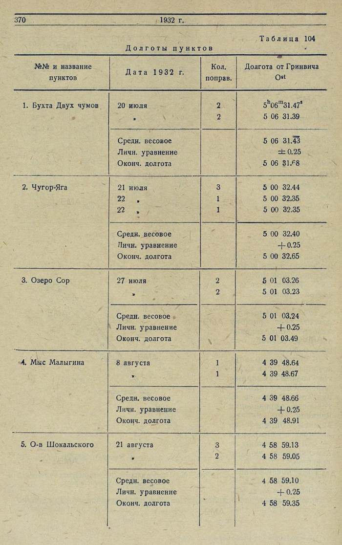 №№ и название пунктов/Дата 1932 г./Кол. поправ./Долгота от Гринвича Ost