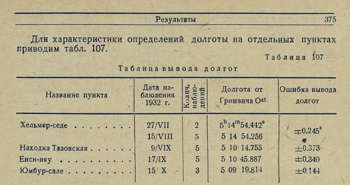 Для характеристики определений долготы на отдельных пунктах приводим табл. 107.
