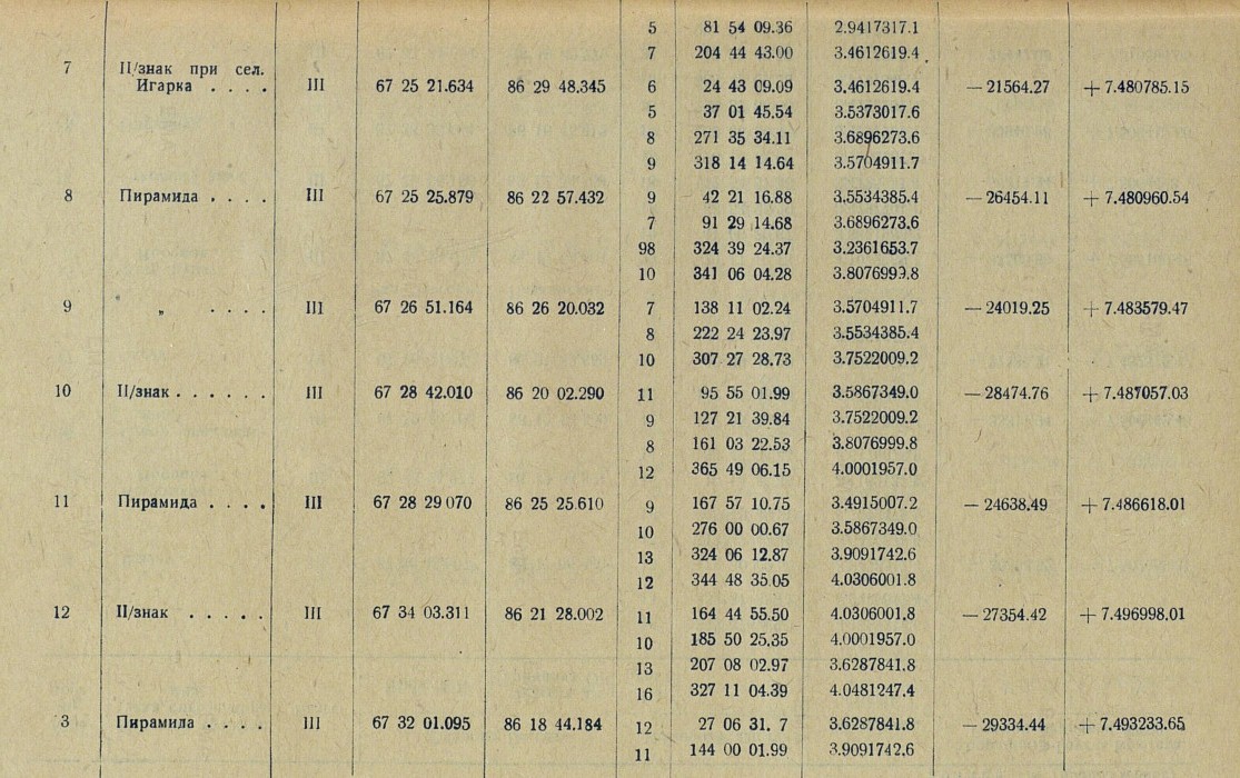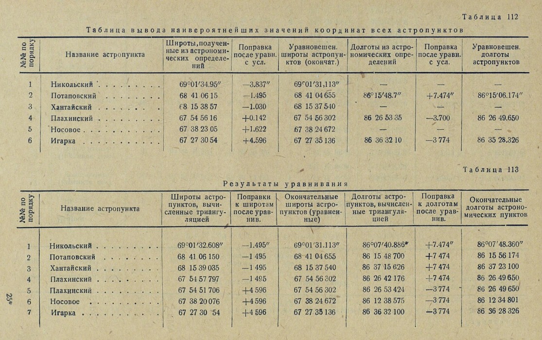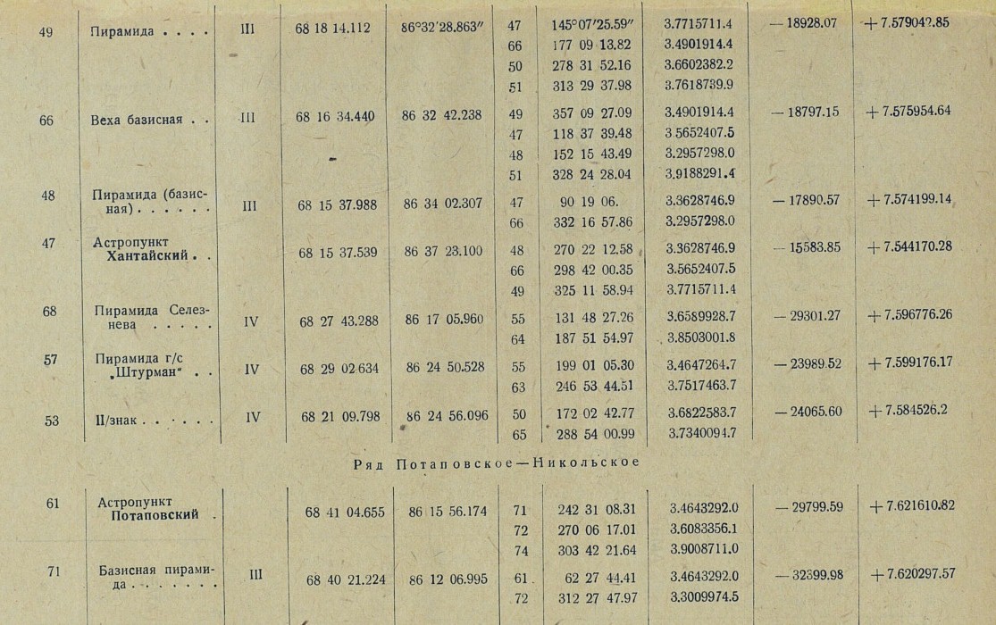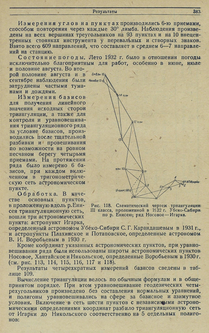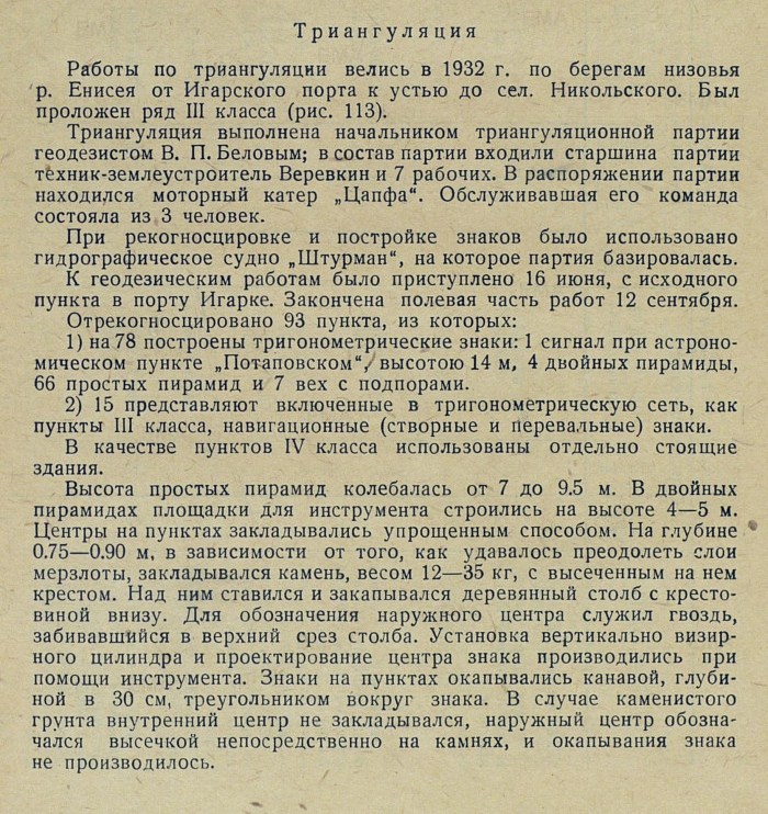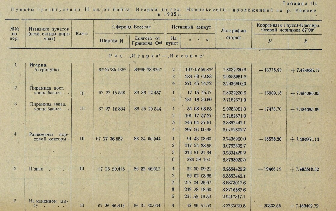 Обработка. В качестве основных пунктов, в проложенную вдоль р. Енисея триангуляционную сеть, вошли три астрономических пункта: астропункт Игарка, определенный астрономом Убеко-Сибири С. Г. Карандашевым в 1931 г., и астропункты Плахинское и Потаповское, определенные астрономом В. И. Воробьевым в 1930 г.