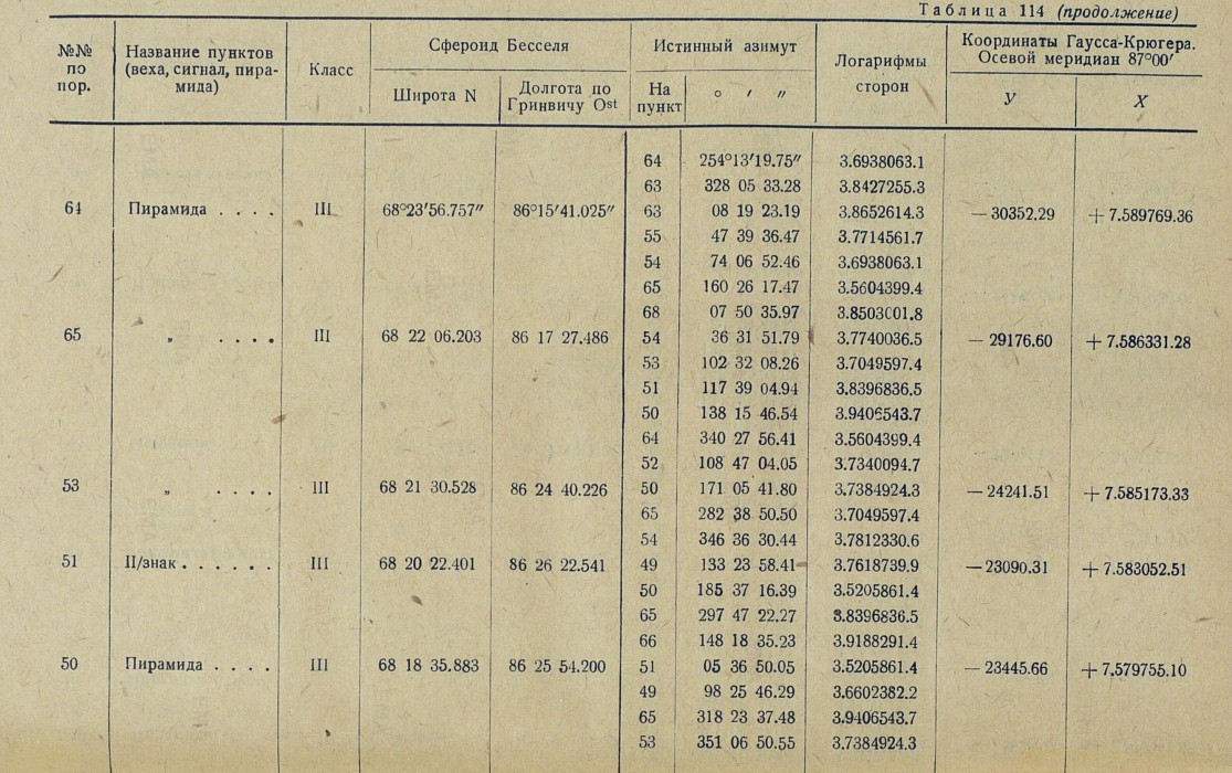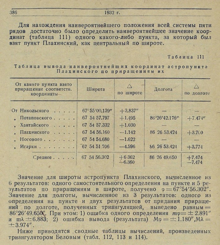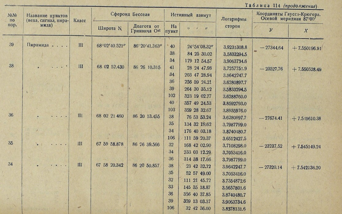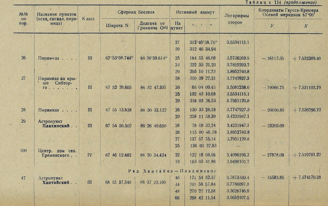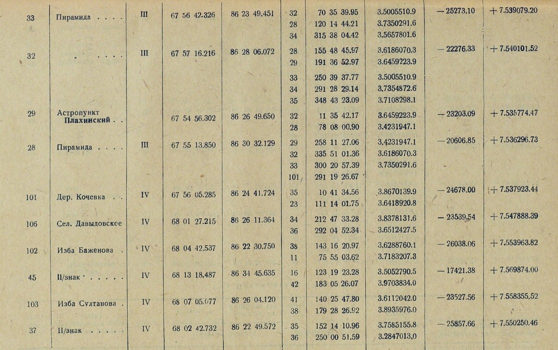 Обработка. В качестве основных пунктов, в проложенную вдоль р. Енисея триангуляционную сеть, вошли три астрономических пункта: астропункт Игарка, определенный астрономом Убеко-Сибири С. Г. Карандашевым в 1931 г., и астропункты Плахинское и Потаповское, определенные астрономом В. И. Воробьевым в 1930 г.