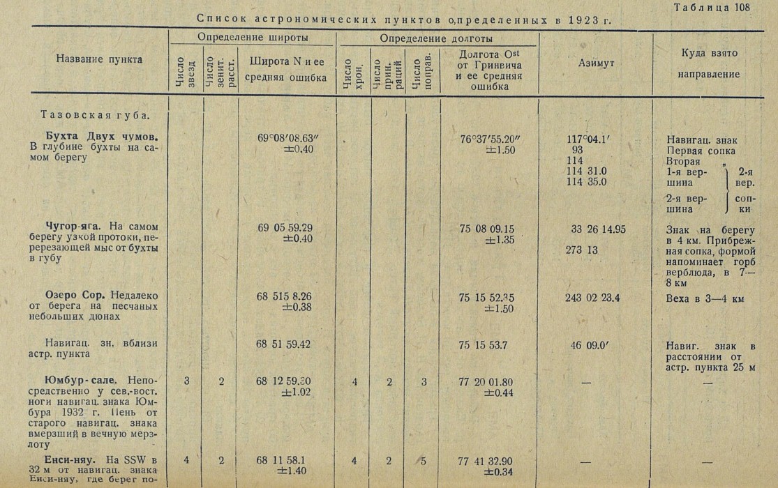 Название пункта/Определение широты (Число звезд\Число зенит. расст.\Широта N и ее средняя ошибка)/Определение долготы (Число хрон.\Число прин. раций\Число поправ.\Долгота Ost от Гринвича и ее средняя ошибка)/Азимут/Куда взято направление