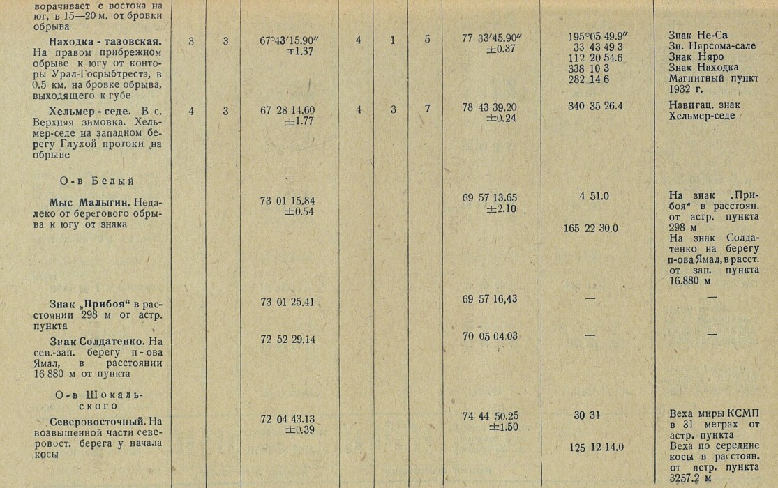 Мыс Малыгин. Недалеко от берегового обрыва к югу от знака 73 01 15.84 ±0.54 69 57 13.65 ±2.10 4 51.0 165 22 30.0 На знак "Прибоя" в расстоян. от астр. пункта 298 м На знак Солдатенко на берегу п-ова Ямал, в расст. от зап. пункта 16.880 м