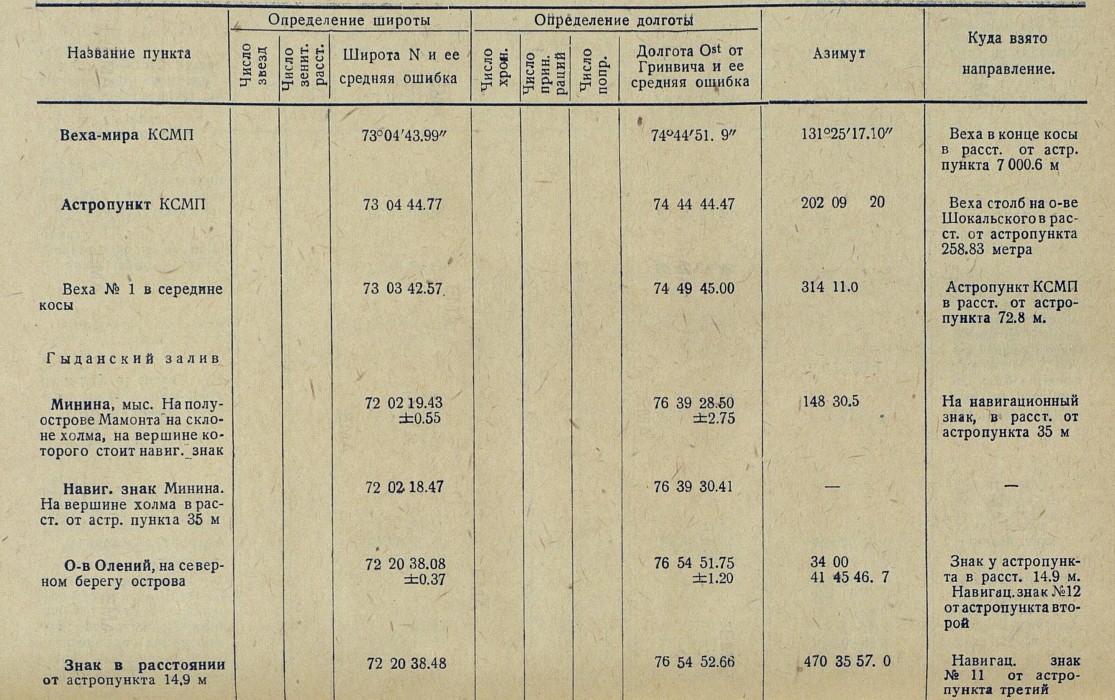 Минина, мыс. На полуострове Мамонта на склоне холма, на вершине которого стоит навиг. знак 72 02 19.43 ±0.55 76 39 28.50 ±2.75 148 30.5 На навигационный знак, в расст. от астропункта 35 м